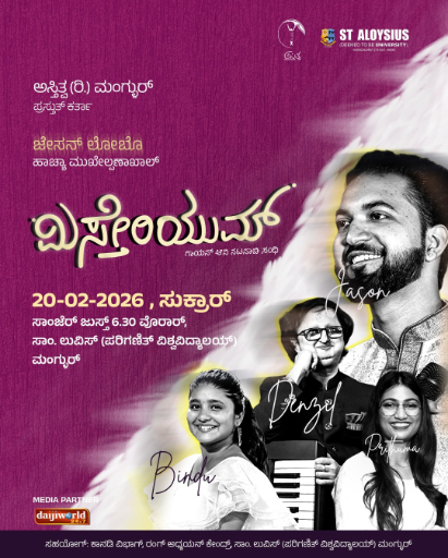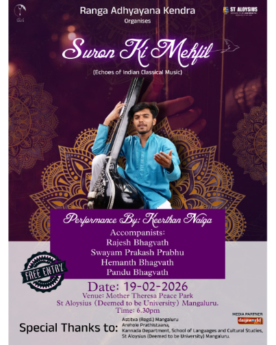 Astitva (R), Mangaluru in association with Ranga Adhyayana Kendra, Arehole Prathistaana, Kannada Department and School of Languages and Cultural Studies, St Aloysius (Deemed to be University) is pleased to announce a two-day musical series titled “Suron Ki Mehfil” and “Mysterium.” The performances will be held at the Mother Theresa Peace Park, St Aloysius (Deemed to be University), at 6:30 PM on February 19 and 20, 2026.