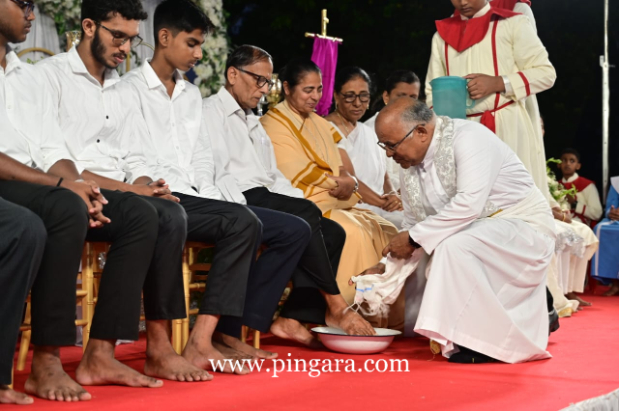 Mangalore: The Diocese of Mangalore entered the sacred Paschal Triduum with profound devotion as Most Rev. Dr Peter Paul Saldanha, Bishop of Mangalore, presided over the Maundy Thursday liturgy at the Holy Spirit Church, Mukka, today at 6:00 PM.
