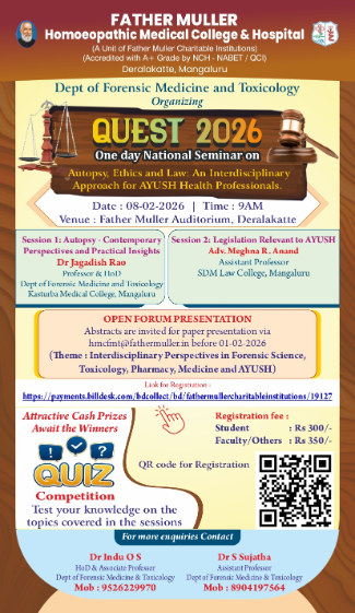 Deralakatte: The Department of Forensic Medicine and Toxicology, Father Muller Homoeopathic Medical College (FMHMC), Deralakatte, will be organizing a one-day National Seminar titled “QUEST 2026” on 8th February 2026 at the FMHMC Auditorium, Deralakatte.