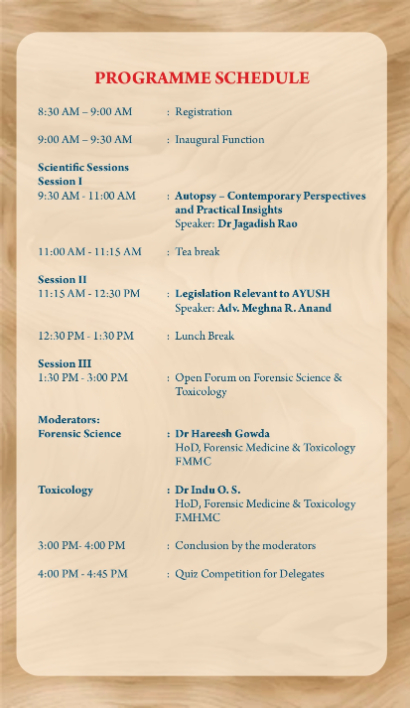 The scientific program includes expert sessions such as “Autopsy – Contemporary Perspectives and Practical Insights” by Dr Jagadish Rao, Professor and Head, Department of Forensic Medicine and Toxicology, Kasturba Medical College, Mangaluru, and a session on “Legislation Relevant to AYUSH” by Adv. Meghna R. Anand, Assistant Professor, SDM Law College, Mangaluru. An Open Forum will also be conducted to promote interdisciplinary perspectives in forensic science and toxicology.This session will be moderated by Dr Hareesh Gouda, Professor and Head, Forensic Medicine and Toxicology, Father Muller Medical College and Dr Indu O S, Associate Professor and Head, Forensic Medicine and Toxicology, Father Muller Homoeopathic Medical College