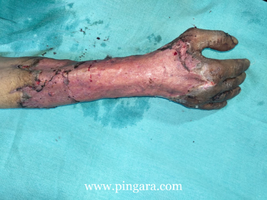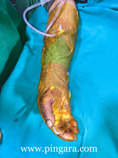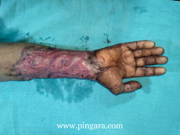 The patient presented with deep, extensive forearm injuries requiring urgent and specialized care. The Plastic Surgery Department undertook a series of advanced, staged procedures including repeated surgical debridements, VAC (vacuum-assisted closure) dressings, and definitive skin grafting to salvage the limb and regain functional use.
