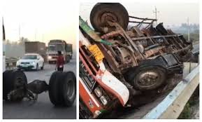 The Canter overturned after the XUV collided with another Brezza car that was coming on the road. The entire highway was like a battlefield. The two rear wheels of the canter were separated from the canter.