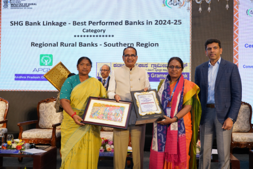 The national-level award presented by the Ministry of Rural Development, Government of India, for the FY-2024-25 to Karnataka Grameena Bank was received by the Bank’s General Manager, V M Rukmini Devi, at a conclave held recently in Hyderabad.