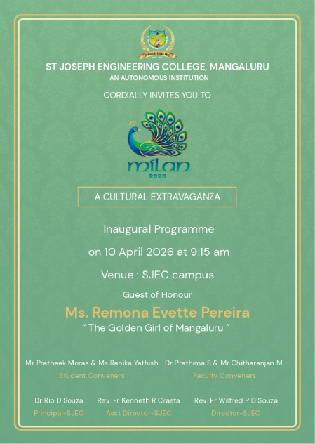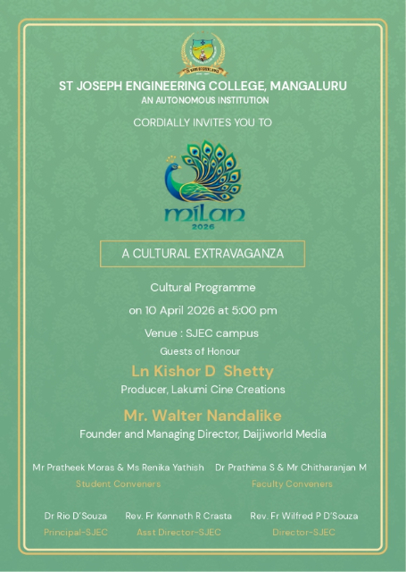 Mangalore: St. Joseph Engineering College (SJEC), Vamanjoor is all set to host Milan 2026, a vibrant cultural extravaganza that celebrates talent, creativity, and unity among students. The much-awaited event will be held on 10 April 2026 at the SJEC campus.