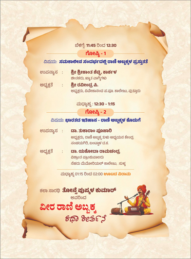 ನಂತರದಲ್ಲಿ ರವೀಂದ್ರ ಪಿ ಇವರ ಅಧ್ಯಕ್ಷತೆಯಲ್ಲಿ ಸಮಕಾಲೀನ ಸಂದರ್ಭದಲ್ಲಿ ರಾಣಿ ಅಬ್ಬಕ್ಕಳ ಪ್ರಸ್ತುತತೆ ಗೋಷ್ಠಿಯಲ್ಲಿ ಶ್ರೀಕಾಂತ್ ಶೆಟ್ಟಿ ಕಾರ್ಕಳ ಹಾಗೆಯೇ ಡಾ. ಯಶೋದಾ ರಾಮಚಂದ್ರ ಅಧ್ಯಕ್ಷತೆಯಲ್ಲಿ ಭಾರತದ ಇತಿಹಾಸ – ರಾಣಿ ಅಬ್ಬಕ್ಕಳ ಕೊಡುಗೆ ಗೋಷ್ಟಿಯಲ್ಲಿ ಡಾ. ತುಕಾರಾಮ್ ಪೂಜಾರಿ ಉಪನ್ಯಾಸ ನೀಡಲಿದ್ದಾರೆ. ಕಲಾ ಸಾರಥಿ ತೋನ್ಸೆ ಪುಷ್ಕಳ ಕುಮಾರ್‌ ಇವರಿಂದ ವೀರ ರಾಣಿ ಅಬ್ಬಕ್ಕ ಕಥಾ ಕೀರ್ತನೆಯೂ ನಡೆಯಲಿದೆ.