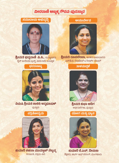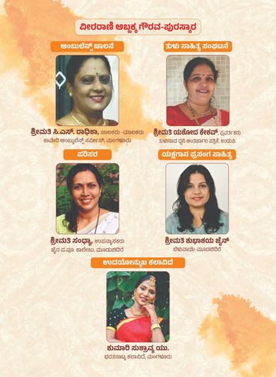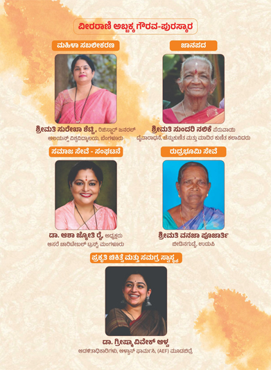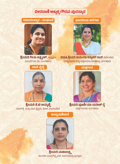 ಈ ಕಾರ್ಯಕ್ರಮದಲ್ಲಿ 21 ಮಹಿಳಾ ಸಾಧಕರಿಗೆ ವೀರ ರಾಣಿ ಅಬ್ಬಕ್ಕ ಗೌರವ ಪುರಸ್ಕಾರ ಪ್ರದಾನ ನಡೆಯಲಿದೆ. ಸುರೇಖಾ ಶೆಟ್ಟಿ (ಮಹಿಳಾ ಸಬಲೀಕರಣ), ಸುಂದರಿ ನಲಿಕೆ ಪೆರುವಾಯಿ (ದೈವಾರಾಧನೆ), ಡಾ. ಆಶಾಜ್ಯೋತಿ ರೈ (ಸಮಾಜಸೇವೆ – ಸಂಘಟನೆ), ವನಜಾ ಪೂಜಾರ್ತಿ ಬೀಡಿನಗುಡ್ಡೆ (ರುದ್ರಭೂಮಿ ಸೇವೆ), ಡಾ ಗ್ರೀಷ್ಮಾ ವಿವೇಕ್ ಆಳ್ವ (ಪ್ರಕೃತಿ ಚಿಕಿತ್ಸೆ ಮತ್ತು ಸಮಗ್ರ ಸ್ವಾಸ್ಥ್ಯ), ಗೀತಾ ಲಕ್ಷ್ಮೀಶ್ (ಬಾಲ ಸಂಸ್ಕಾರ – ಸಂಘಟನೆ), ವಿದುಷಿ ಸುಮಂಗಲ ರತ್ನಾಕರ್ ರಾವ್ (ಭಾರತೀಯ ಕಲೆಗಳು), ಕೆ ಬಿ ಅಮ್ಮಣ್ಣಿ (ನಾಟಿವೈದ್ಯೆ), ಪೂರ್ಣಿಮಾ ಯತೀಶ್ ರೈ (ಯಕ್ಷಗಾನ), ಮಹಾಲಕ್ಷ್ಮೀ ದಾರಂದಕುಕ್ಕು (ಉದ್ಯಮಶೀಲತೆ), ಸಿ ಎಸ್ ರಾಧಿಕಾ (ಆಂಬುಲೆನ್ಸ್ ಚಾಲನೆ), ಯಶೋಧಾ ಕೇಶವ್ ಉಡುಪಿ (ತುಳು ಸಾಹಿತ್ಯ ಸಂಘಟನೆ), ಸಂಧ್ಯಾ ಮೂಡಬಿದ್ರೆ (ಪರಿಸರ), ಶುಭಾಶಯ ಜೈನ್ (ಯಕ್ಷಗಾನ ಪ್ರಸಂಗ ಸಾಹಿತ್ಯ), ಕು. ಶ್ರಾವ್ಯ ಯು (ಉದಯೋನ್ಮುಖ ಕಲಾವಿದೆ), ಭವ್ಯರಾಣಿ ಪಿ ಸಿ (ಸಮುದಾಯ ಅಭಿವೃದ್ಧಿ), ರೂಪಲೇಖಾ (ಆಯುರ್ವೇದ), ಶಾಲಿನಿ ಆತ್ಮಭೂಷಣ್ ಪುತ್ತೂರು (ಭರತನಾಟ್ಯ), ಶುಭಾ ಅಡಿಗ ಪುತ್ತೂರು (ತಾಳಮದ್ದಳೆ), ಕು. ಶಹನಾ ಮುಮ್ತಾಜ್ ನೆಲ್ಯಡ್ಕ (ಪತ್ರಿಕೋದ್ಯಮ), ಕೆ ಎನ್ ದೀಪಿಕಾ (ಯೋಗ ಮತ್ತು ಧ್ಯಾನ) ಇವರುಗಳು ಗೌರವ ಸನ್ಮಾನವನ್ನು ಪಡೆಯಲಿದ್ದಾರೆ.