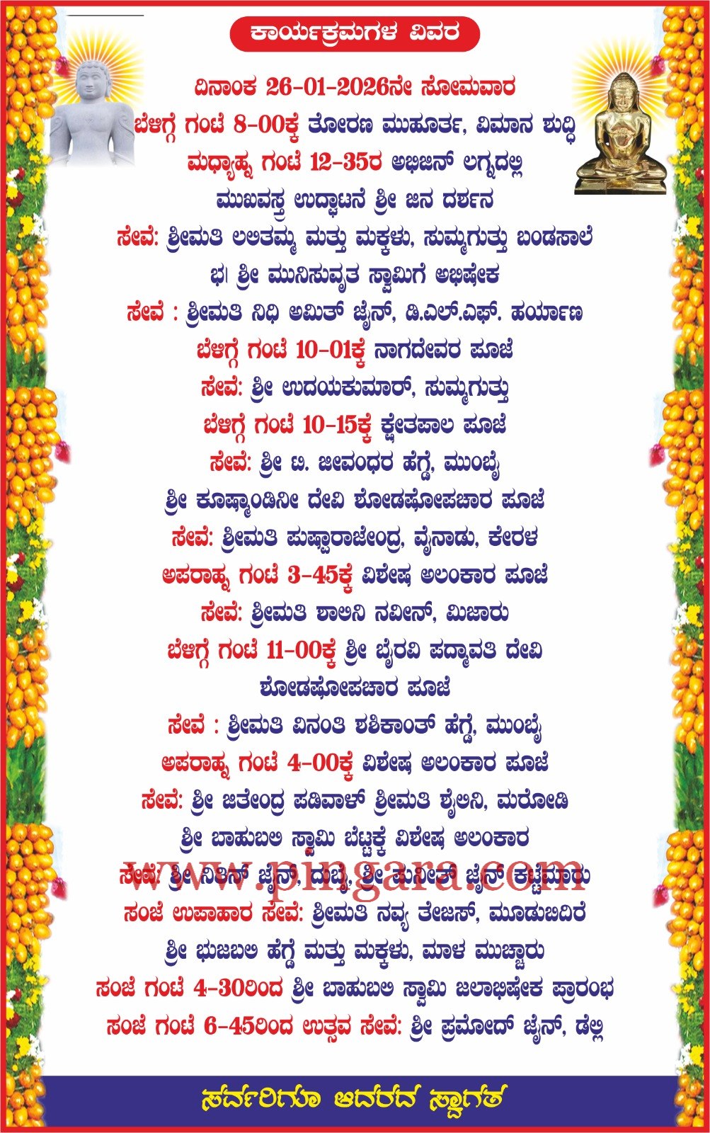 ಈ ಧಾರ್ಮಿಕ ಕಾರ್ಯಕ್ರಮವು ಜಗದ್ಗುರು ಸ್ವಸ್ತಿಶ್ರೀ ಚಾರುಕೀರ್ತಿ ಭಟ್ಟಾರಕ ಪಂಡಿತಾಚಾರ್ಯ ವರ್ಯ ಮಹಾಸ್ವಾಮೀಜಿಗಳ ಮಾರ್ಗದರ್ಶನ ಹಾಗೂ ನೇತೃತ್ವದಲ್ಲಿ ನಡೆಯಲಿದೆ. ಕಾರ್ಯಕ್ರಮದ ಅಂಗವಾಗಿ ಭಗವಾನ್ ಮುನಿಸುವ್ರತ ಸ್ವಾಮಿ ಬಸದಿ ತೋರಣ ಮುಹೂರ್ತ, ವಿಮಾನ ಶುದ್ಧಿ, ಭಗವಂತನ ಮಹಾಭಿಷೇಕ, ನಯನೋನ್ಮಿಲನ ನಡೆಯಲಿದೆ. ಮಧ್ಯಾಹ್ನದಲ್ಲಿ ಮುಖವಸ್ತ್ರ ಉದ್ಘಾಟನೆ ಕಾರ್ಯಕ್ರಮ ಹಮ್ಮಿಕೊಳ್ಳಲಾಗಿದೆ.