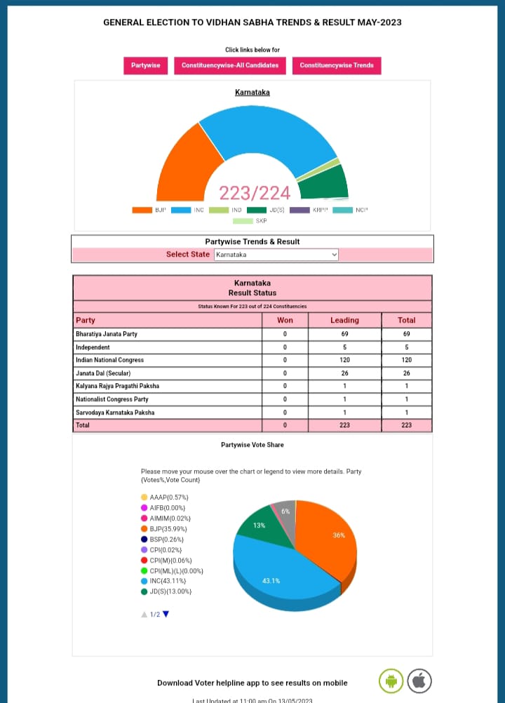 Congress sharing a vote sharing of 43% against 36% bjp and 13% JDS as per election commission of India charts of results.