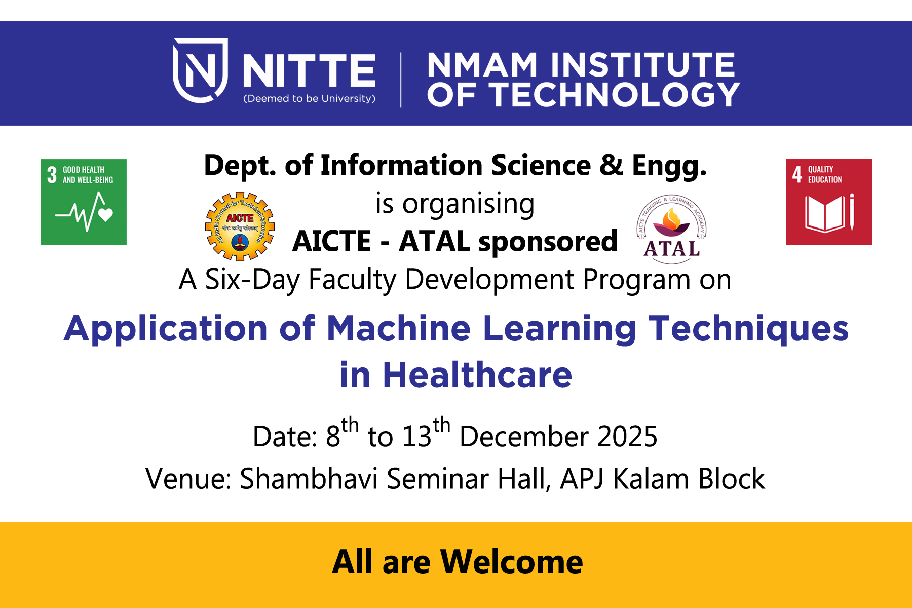 ನಿಟ್ಟೆ: ನಿಟ್ಟೆ ಮಹಾಲಿಂಗ ಅಡ್ಯಂತಾಯ ಸ್ಮಾರಕ ತಾಂತ್ರಿಕ ಮಹಾವಿದ್ಯಾಲಯದ ಮಾಹಿತಿ ವಿಜ್ಞಾನ ಮತ್ತು ಇಂಜಿನಿಯರಿಂಗ್ ವಿಭಾಗವು ಎಐಸಿಟಿಇ-ಅಟಲ್ ಪ್ರಾಯೋಜಿತ ಆರು ದಿನಗಳ ಫ್ಯಾಕಲ್ಟಿ ಡೆವಲಪ್ಮೆಂಟ್ ಪ್ರೋಗ್ರಾಂ (FDP) — “ಎಪ್ಲಿಕೇಶನ್ ಆಫ್ ಮೆಶಿನ್ ಲರ್ನಿಂಗ್ ಟೆಕ್ನಿಕ್ಸ್ ಇನ್ ಹೆಲ್ತ್ಕೇರ್” ಎಂಬ ವಿಷಯದ ಬಗೆಗೆ, ಡಿಸೆಂಬರ್ 8 ರಿಂದ 13ರ ವರೆಗೆ ಆಯೋಜಿಸಿದೆ.