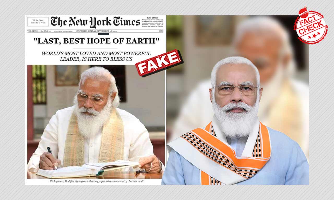 ಸೆಪ್ಟೆಂಬರ್ 29ರಂದು ನ್ಯೂಯಾರ್ಕ್ ಟೈಮ್ಸ್ನ ಟ್ವಿಟರ್ ಸಂವಹನ ವಿಭಾಗದವರು ನ್ಯೂಯಾರ್ಕ್ ಟೈಮ್ಸ್ನ ಸೆಪ್ಟೆಂಬರ್ 26ರಂದು ಮುಖಪುಟದಲ್ಲಿ ಪ್ರಕಟವಾದ ಮೋದಿ ಫೋಟೋ ಸಂಪೂರ್ಣ ನಕಲಿ ಸೃಷ್ಟಿ ಎಂದು ಹೇಳಿತು.