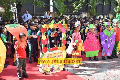 The programme began with a melodious prayer song, followed by a warm welcome address by HithaishiDatt of KG–II A. The significance of Bagless Day was shared by ThanvikaNarendiran and ShaiviShaileshRai of KG–II B, while FathimaInara of KG–II C spoke on the theme “Fruity Fun Land”, celebrating health, nutrition, and the joy of fruits.