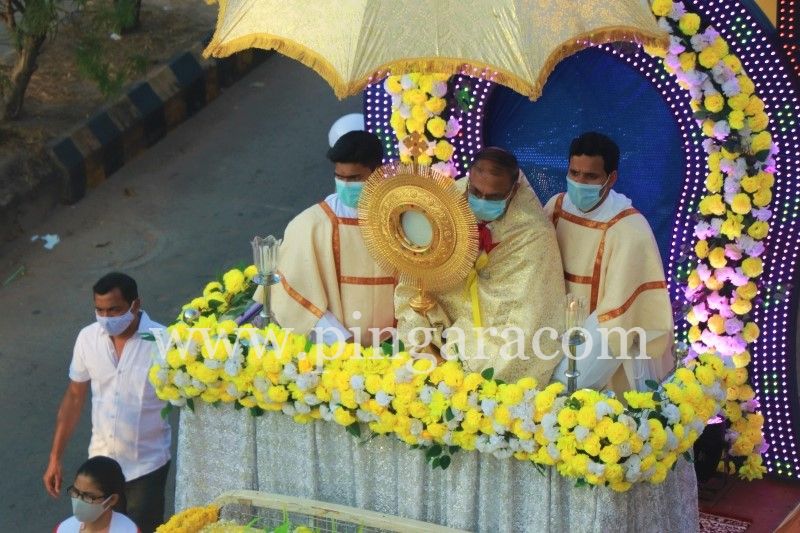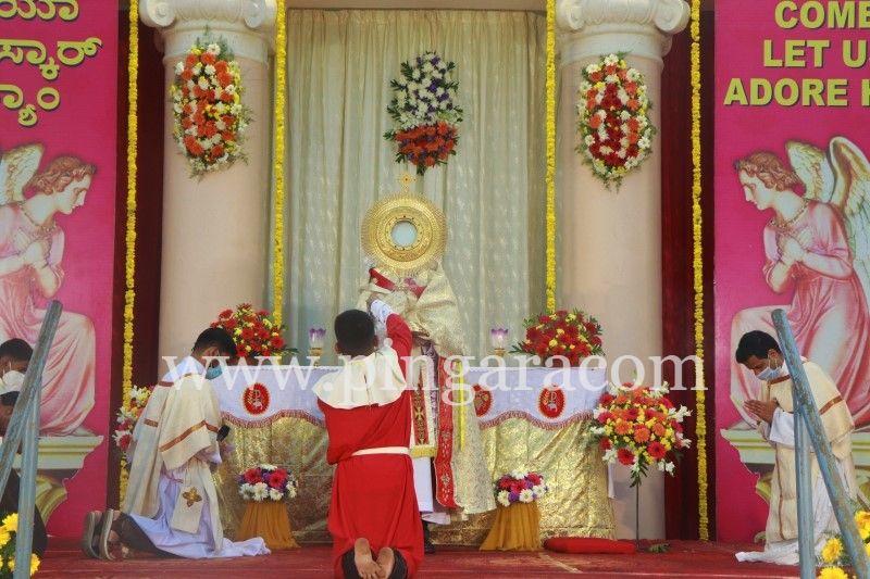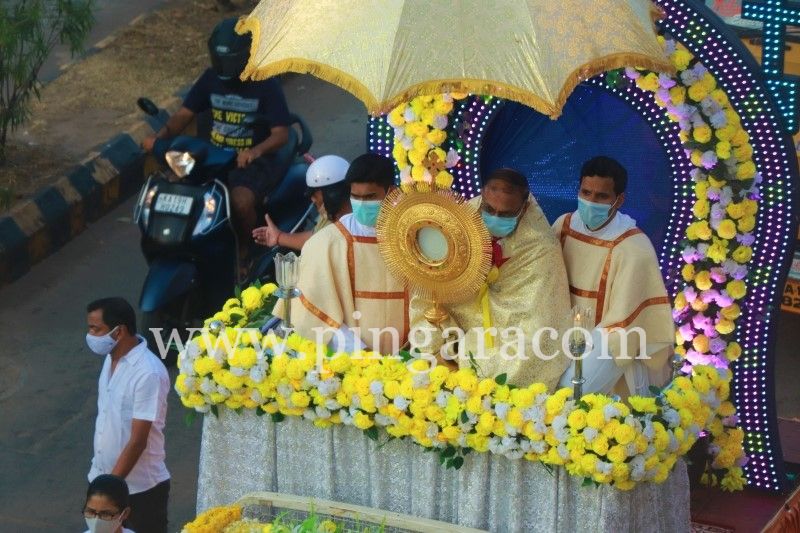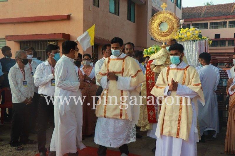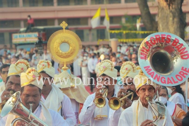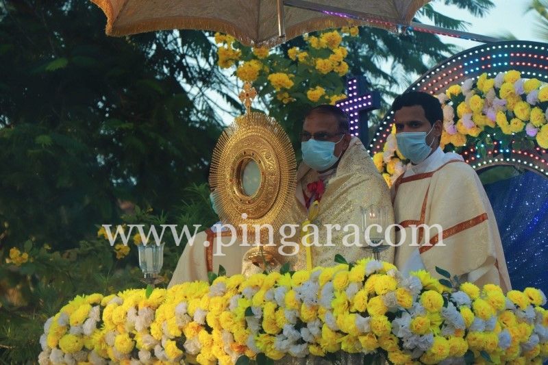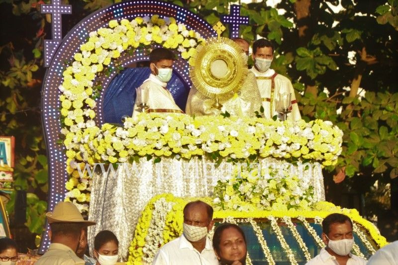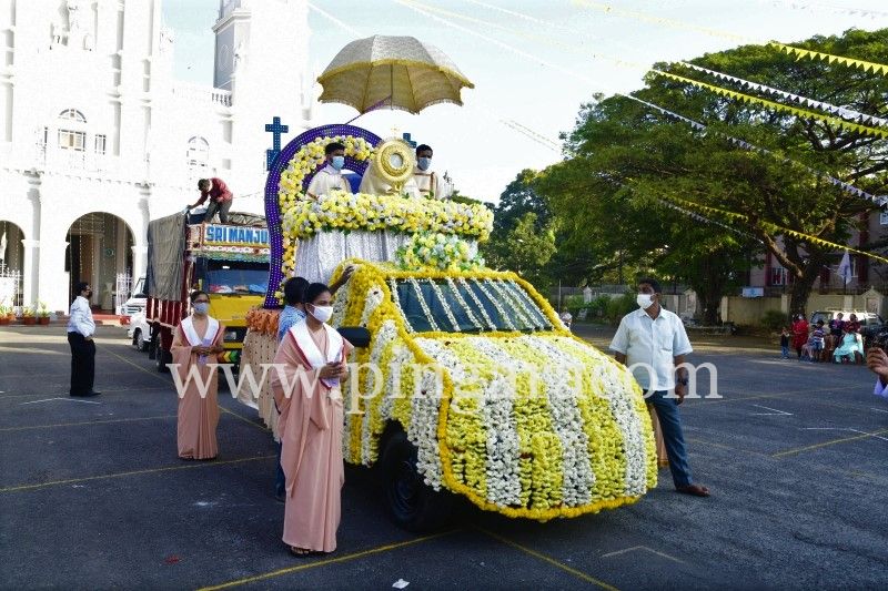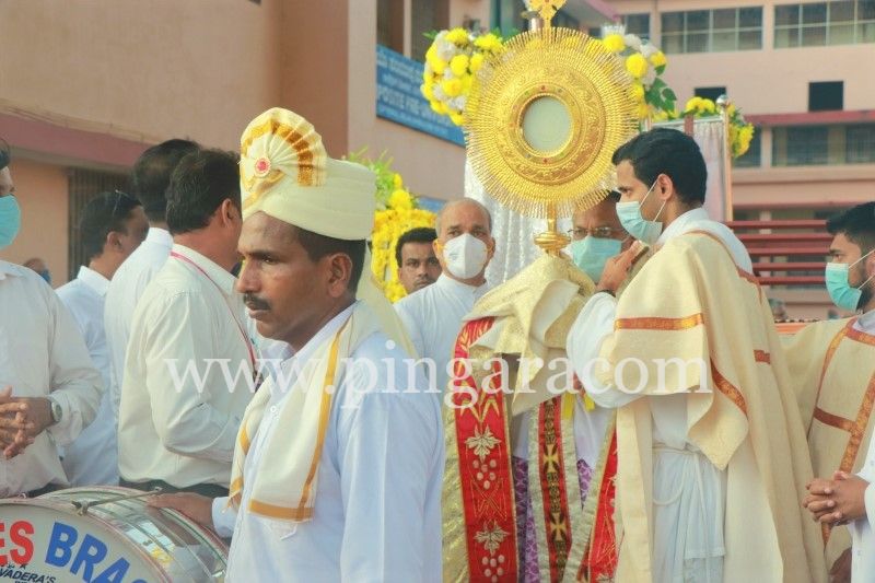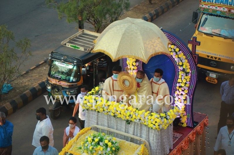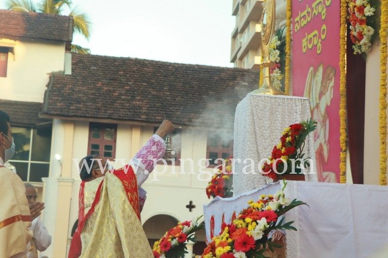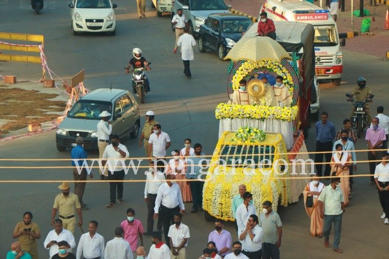 Prior to the procession, mass was offered by Most Rev. Dr Peter Paul Saldanha, Bishop of Mangalore at Milagres Church, after which the Eucharistic procession was held. The procession led by the bishop culminated at Rosario Cathedral with adoration.