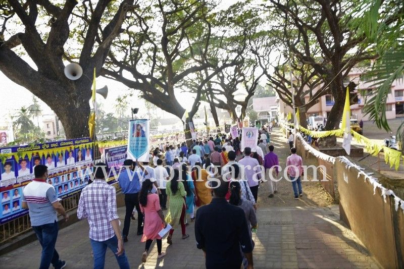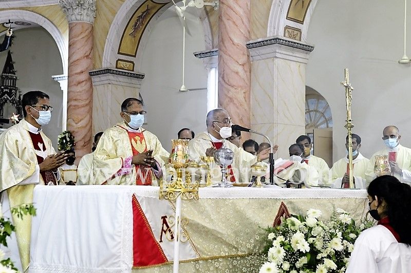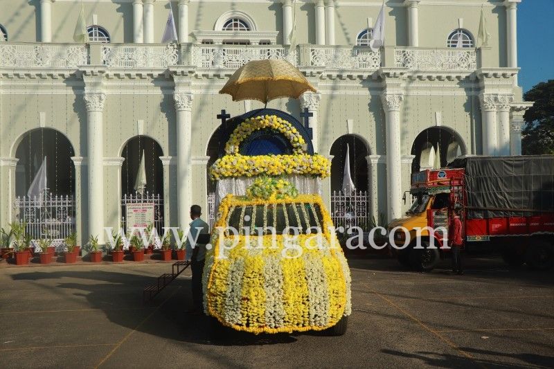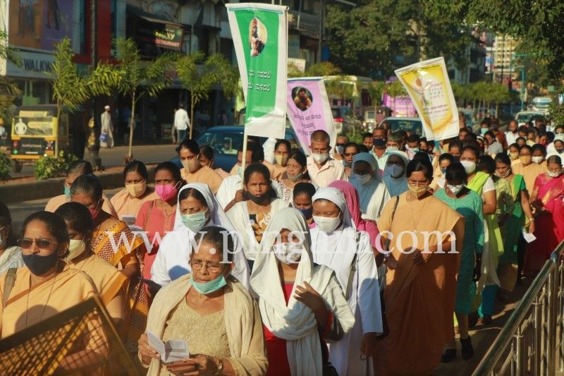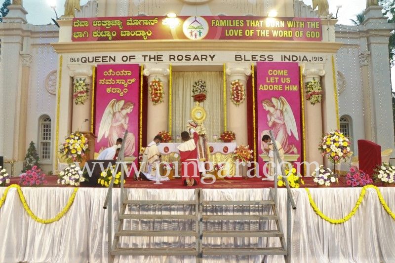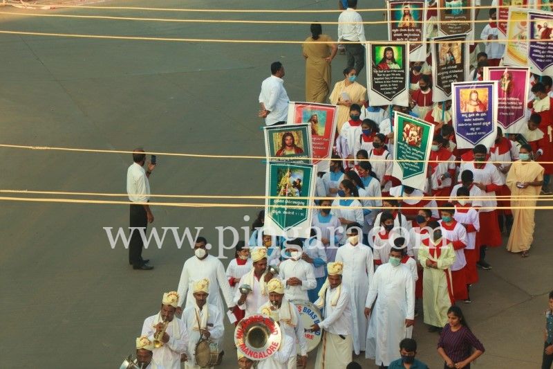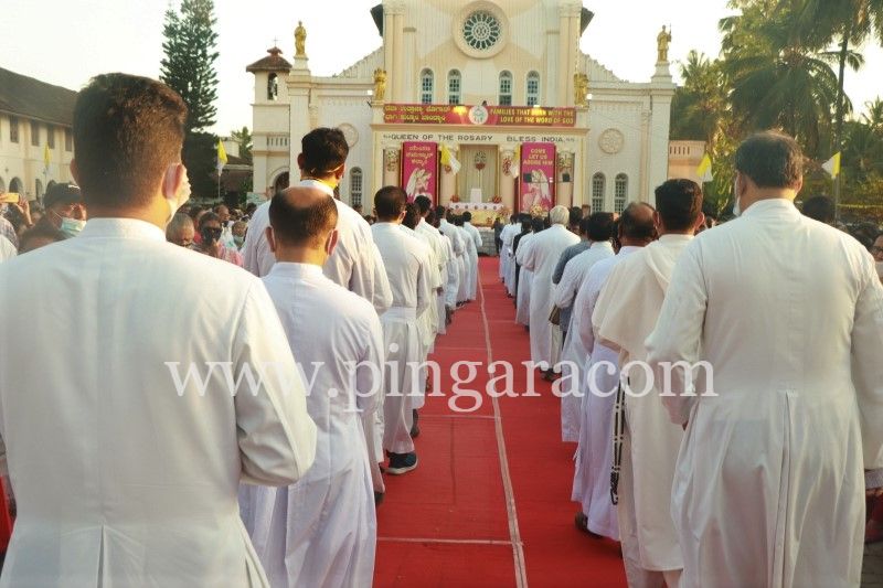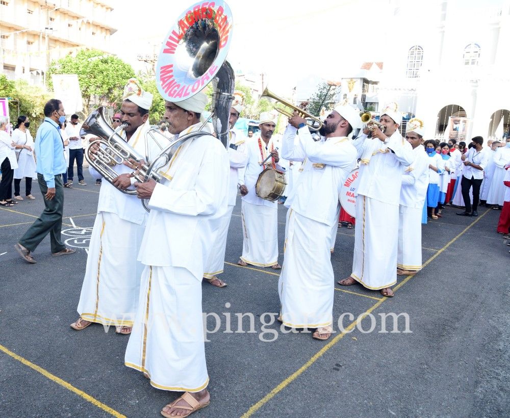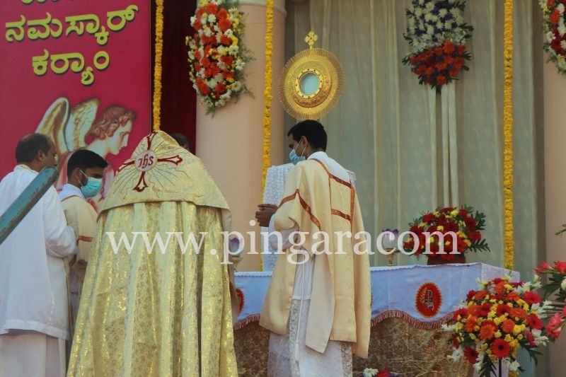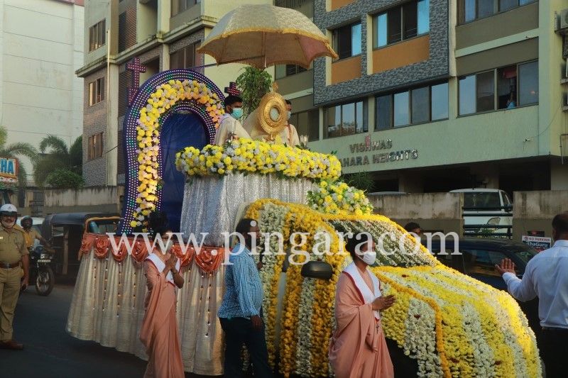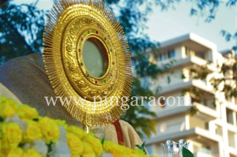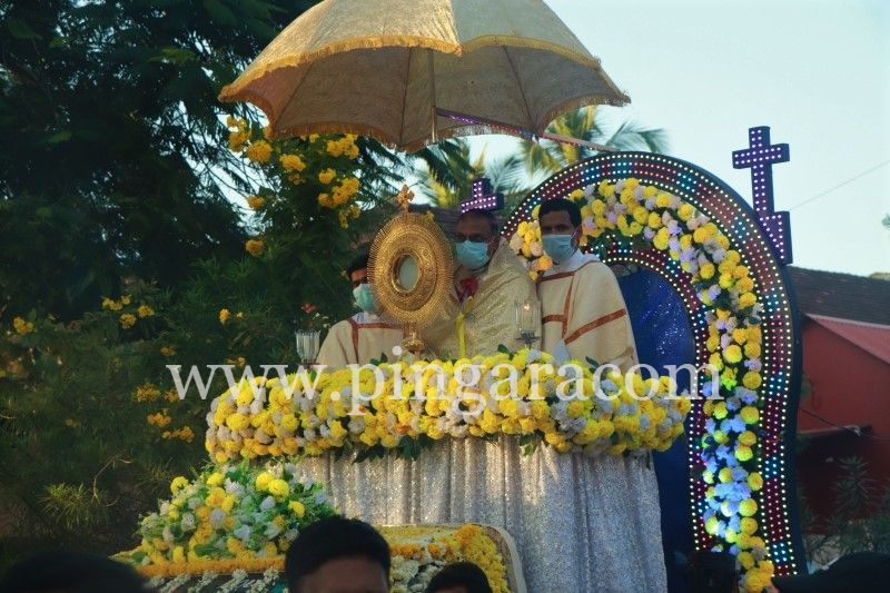 Prior to the procession, mass was offered by Most Rev. Dr Peter Paul Saldanha, Bishop of Mangalore at Milagres Church, after which the Eucharistic procession was held. The procession led by the bishop culminated at Rosario Cathedral with adoration.