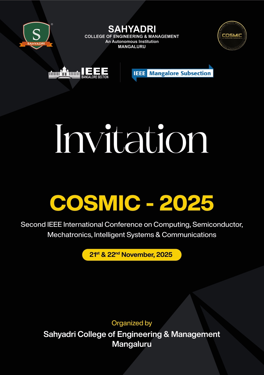 Sahyadri has always prioritized research and innovation through various initiatives, including Synergia, Social Innovation Projects, the Sahyadri Science Talent Hunt, and hosting prominent conferences. The COSMIC-2025, one of Sahyadri's flagship events, will take place in the college campus in Mangaluru, Karnataka, India and is Supported by the IEEE Bangalore Section.This international conference is set to draw experts and enthusiasts from diverse fields including Computing, Semiconductor, Mechatronics, Intelligent Systems, and Communications.
