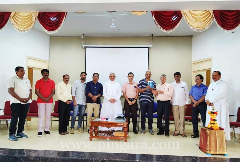On the dais Bishop Lawrence, NSC Chairman Bro. Joy Anthony, Resource person Bro. Savio Mascarenhas from Goa, Sannidhi Director Fr Duming Dias, Officiating chairman of KRSC Bro. Joachim Pinto and Sis. Amorita D'Cunha - Secretary of KRSC were present. KRSC Spiritual Director Fr Franklin D'Souza as well as local host compared the program. Bishop Lawrence Mukkuzhy officially opened the Reconstitution meeting.