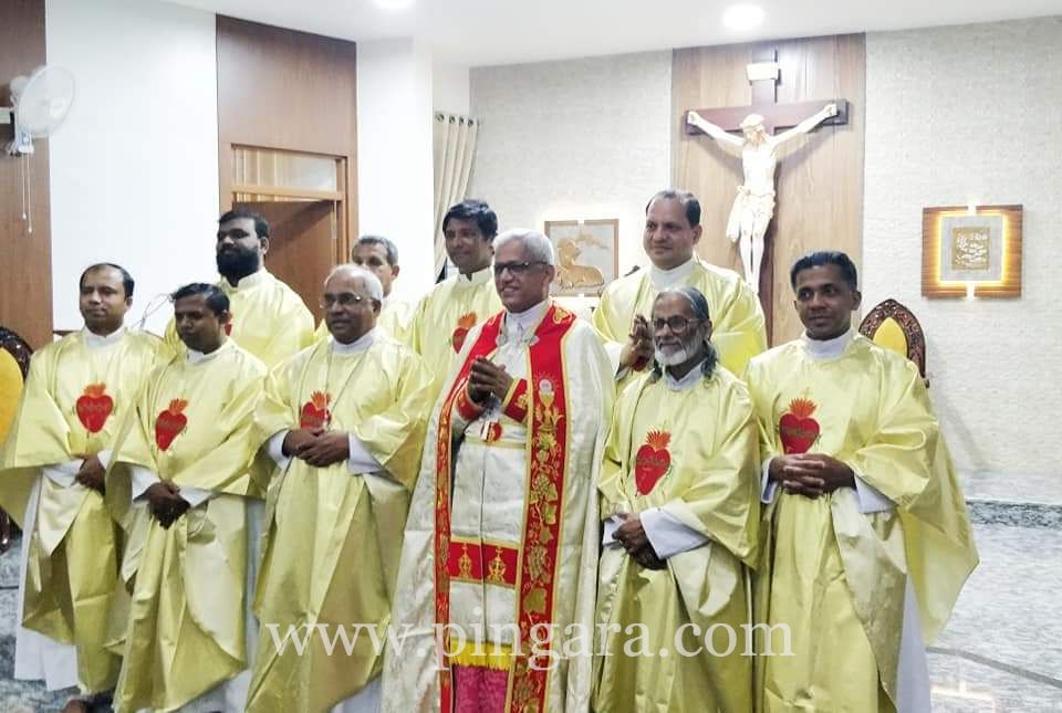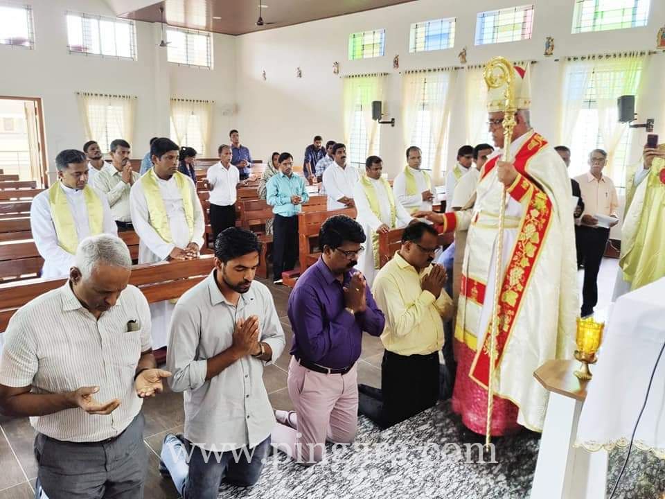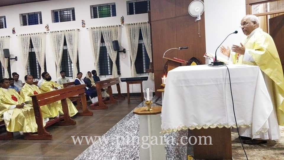At 7pm Most Rev. Dr Francis Serrao SJ, Bishop of Diocese of Shimoga offered the Eucharistic celebration together with Bishop Lawrence, Monsignor Philiph Kutty- Vicar General of Diocese of Belgaum and ten spiritual Directors of various Dioceses of Karnataka. In his homily he spoke on "Witnessing the Word of God in the Region of Karnataka". He explained the Mathew 7:24-28.