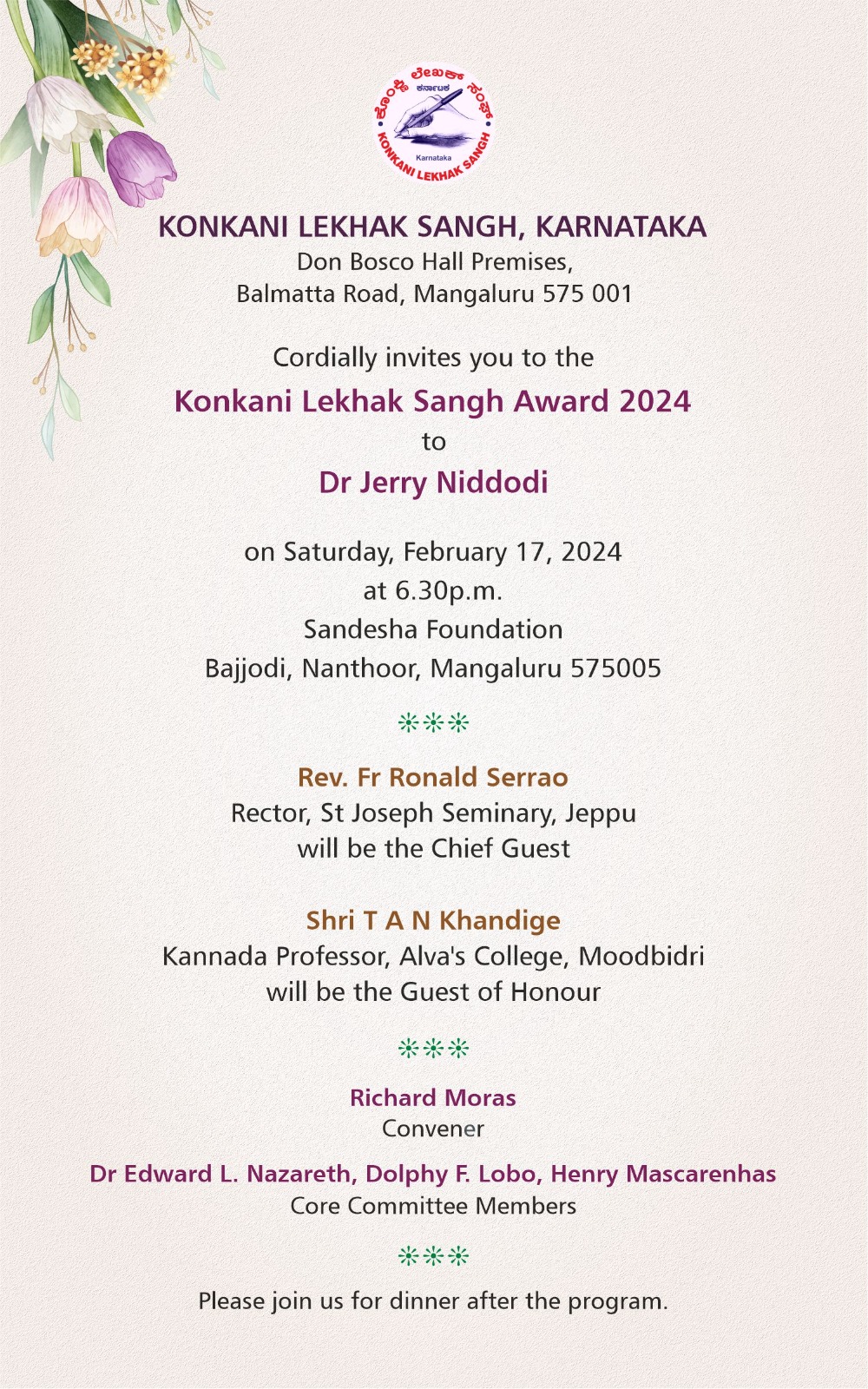 For the year 2024, Konkani Lekhak Sangh award committee has selected a well known Konkani writer Dr Gerald Pinto (Gerry Niddodi).