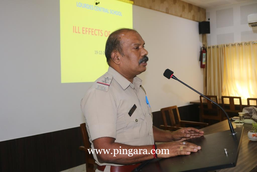 Yogishwaran addressed the students of class IX and asked them a few questions on crime, drugs and mobile phone. He gave the students an awareness on how to follow the law and not to involve in fights. He stressed that because of the negligence of children, the parents face the consequences. He urged the students to think twice before doing something, respect their parents, teachers and elders and avoid doing wrong things. He appreciated the students of Lourdes Central School for having no complaints or any issues of breaking the law.