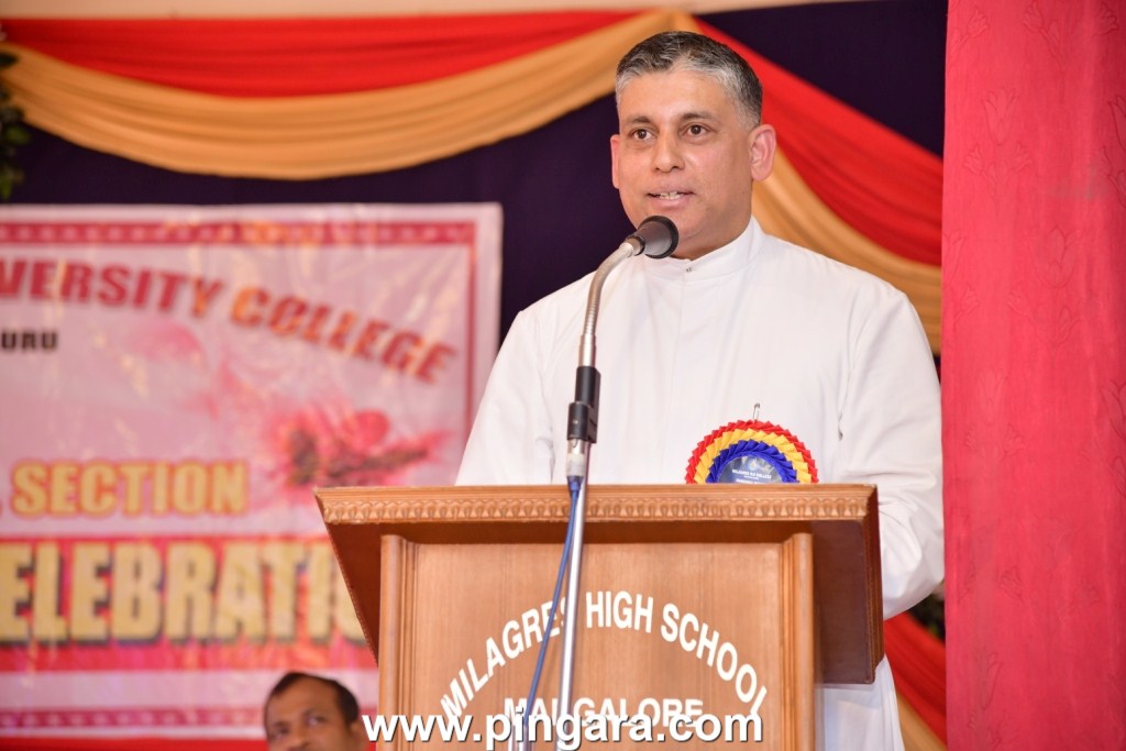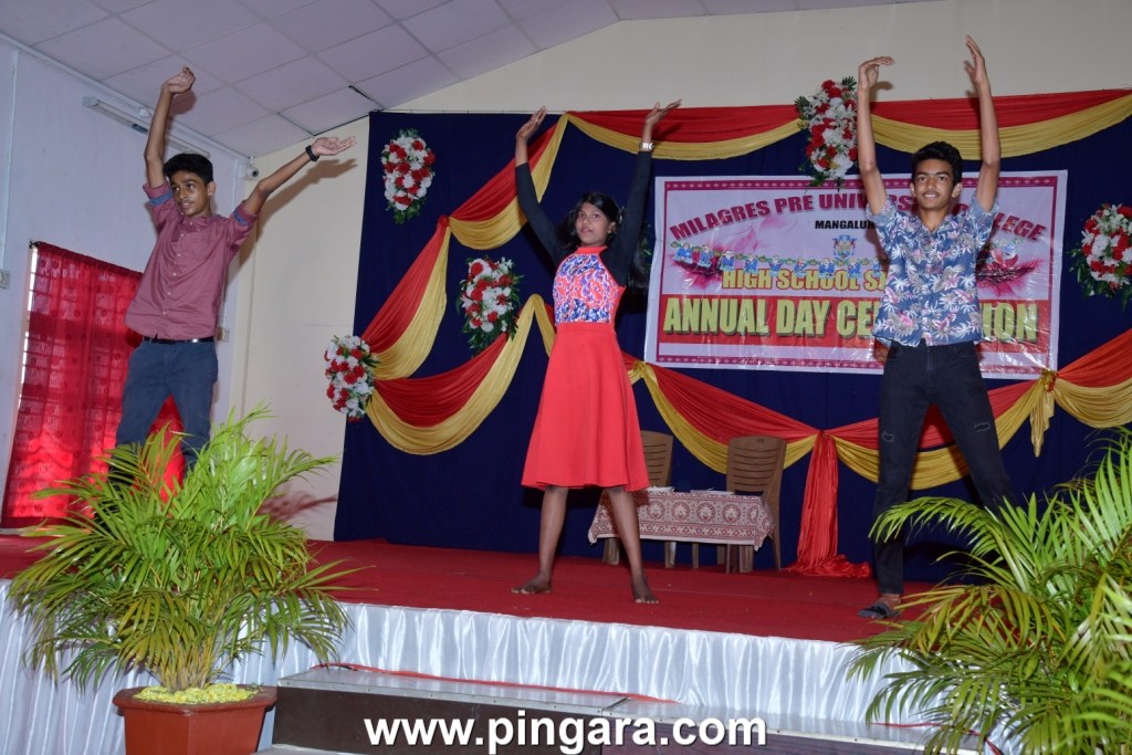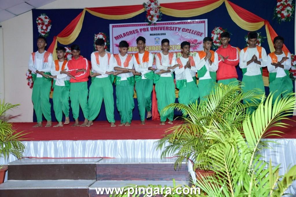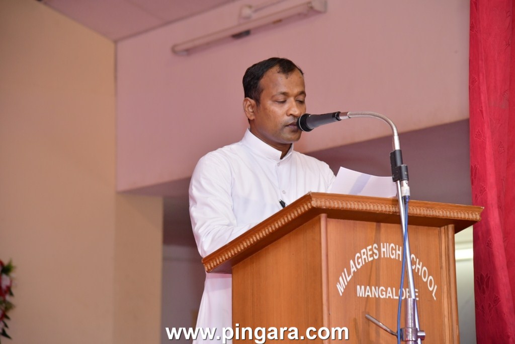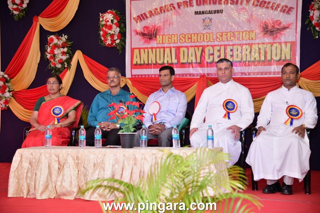 Mangalore: Milagres High School celebrated its Annual Day on 10th December 2019 at the Milagres College Auditorium. Correspondent of the Milagres Educational Institutions Rev Fr Joseph Lobo presided over the programme. Rahul Suvarna, Alumnus, was the Chief Guest and was felicitated during the programme. Stany Baretto, Senior Staff welcomed the gathering.Vice Principal Rev. Fr. Maxy D Souza presented the annual report of the school which highlighted the excellent performance of students in academics and extra curricular activities.The toppers of S.S.L.C. 2019 batch and meritorious student were awarded prizes.The students displayed their talents by presenting cultural events such as dances, skits, mime with patriotic themes. The audience enjoyed the colorful cultural programme presented by the students. The programme concluded with the vote of thanks by Anita Monteiro.