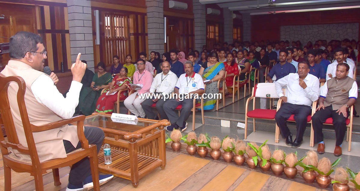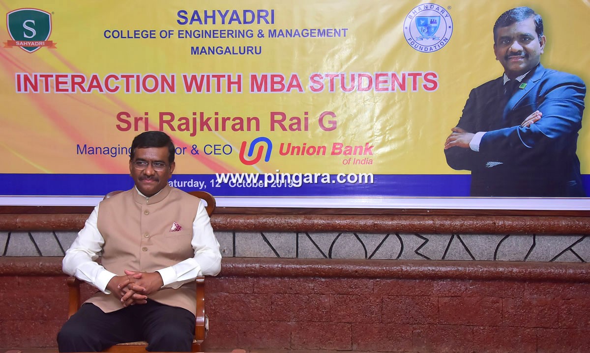 Mangalore: RajkiranRai G, Managing Director and CEO of Union Bank of India, was at the campus to address the 1st year MBA students. Chairman Manjunath Bhandary, in his introductory speech while referring to Rajkiran Rai said that Sahyadri is blessed with unexpected visits from eminent personalities contributing to the growth and development of the students. Chairman urged the students to keenly observe the personality of Rajkiran and then the position he holds. He acknowledged that Rai is one of the very few contemporaries of his who achieved the goal as planned with utmost Clarity, Dedication and Commitment. He said Rai is a perfect example of attaining success in multi-disciplinary field - Education in Agricultural Science and Excellence in Banking Sector. He referred to .Rai as a custodian of crores of money belonging to people.