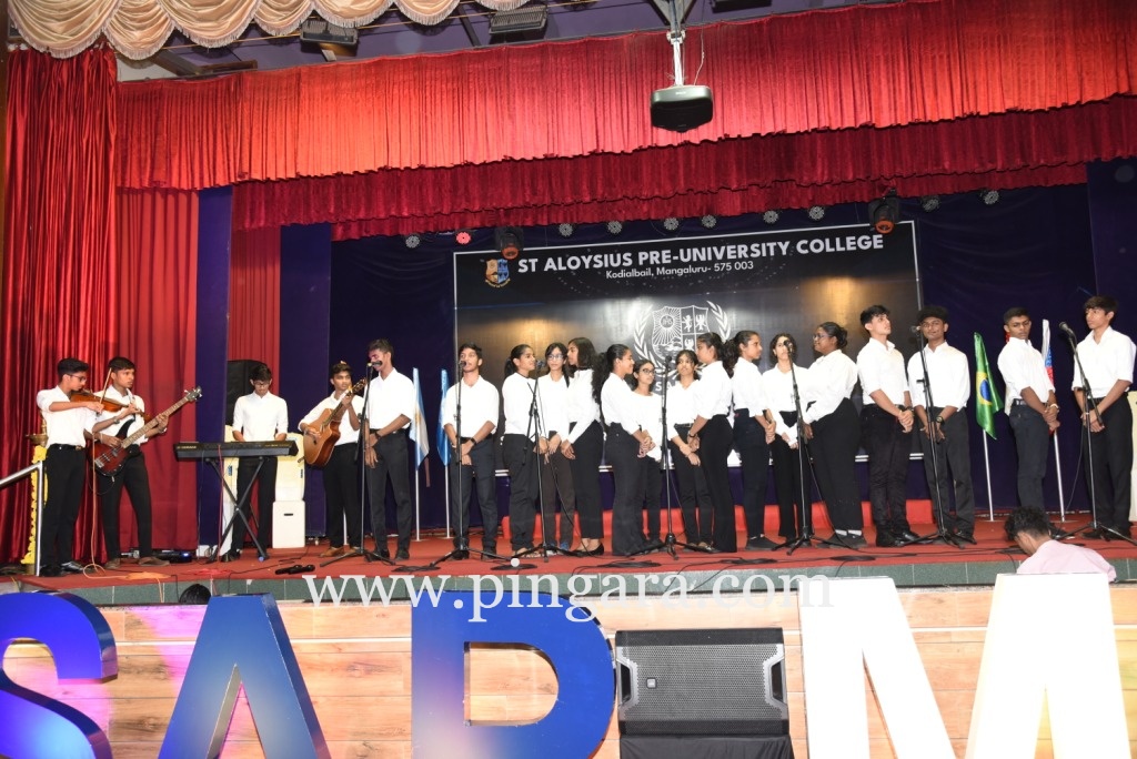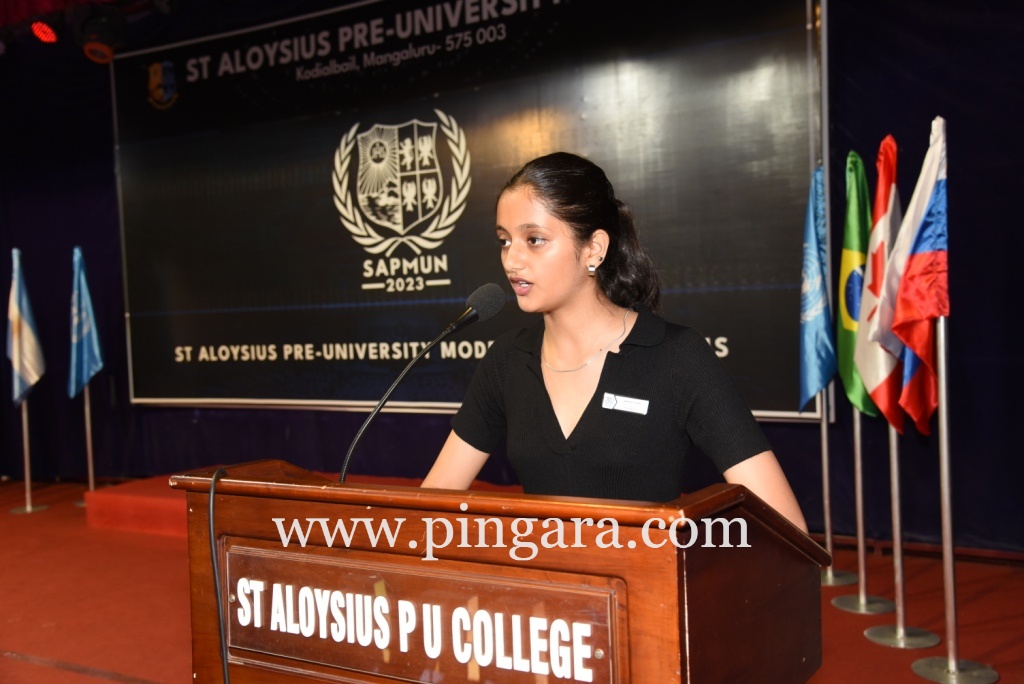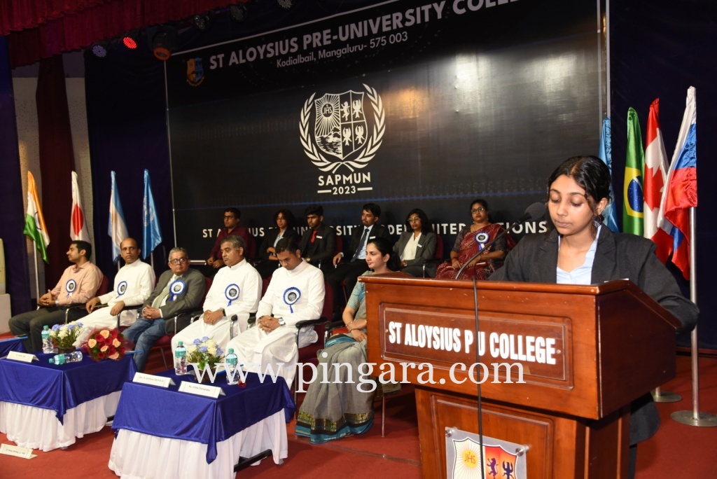 Finance officer Rev. Fr Pradeep Sequeira SJ, Campus Minister Rev. Fr Anthony Derrick SJ, Vice Principals- Vilma Fernandes and Muralikrishna G M, Deans- Dr Pradeep M and Kiran Shetty and the staff coordinators Anisha Andrade and Sheethal Neeliyara, Jennifer Pinto and Arun Dsouza, Director General, Mr Krish Chowta, and President of SAPMUN Rochelle Dsouza, Vice President Shloka Rai were present on the dais