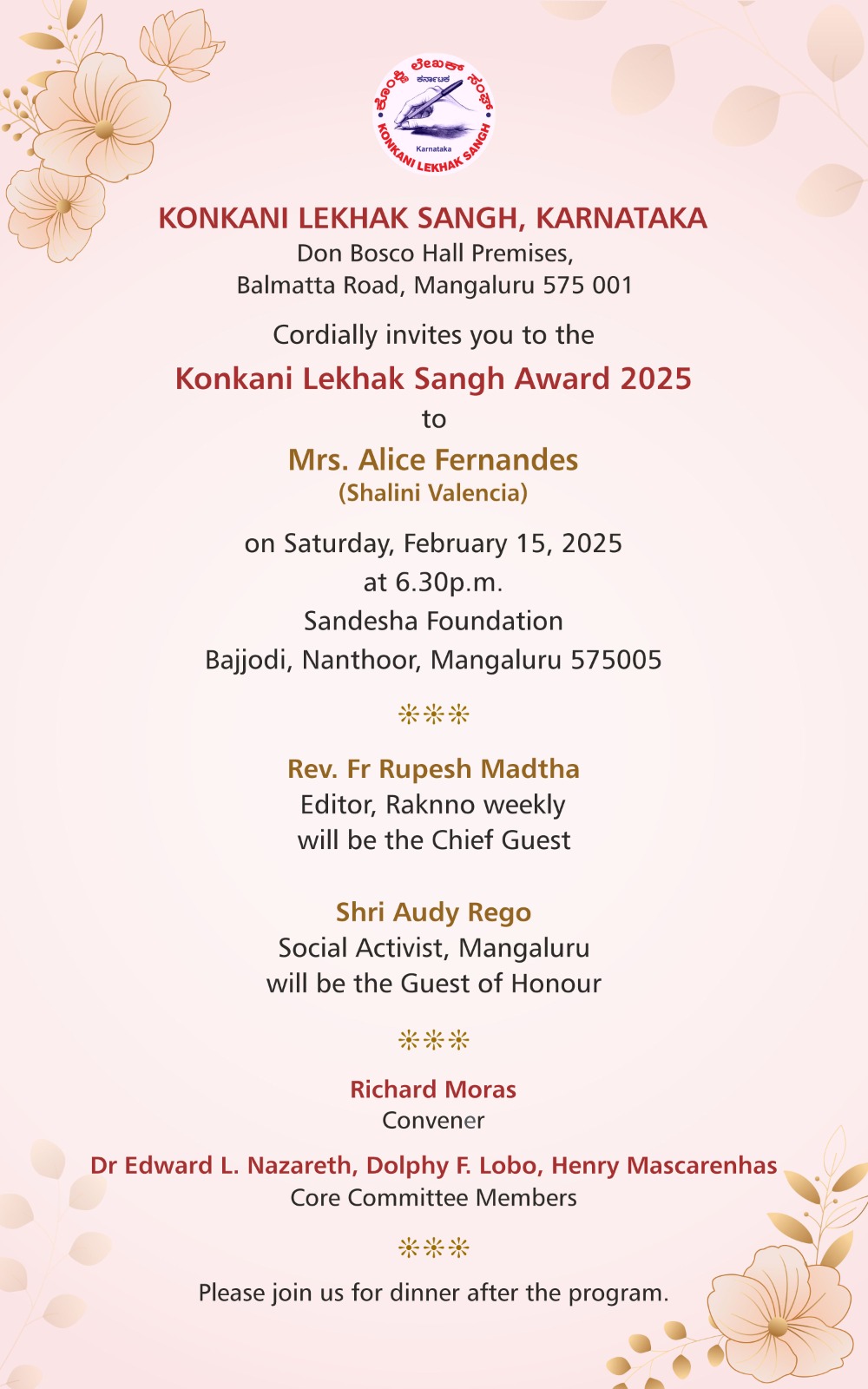 For the year 2025, Konkani Lekhak Sangh award committee has selected a well known Konkani writer Alice Fernandes (Shalini Valencia).