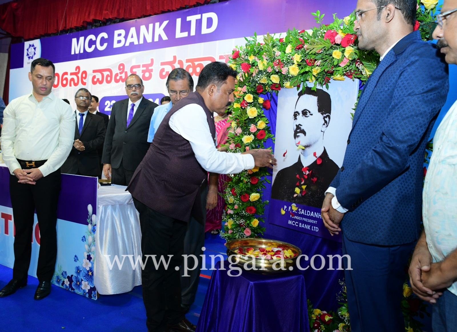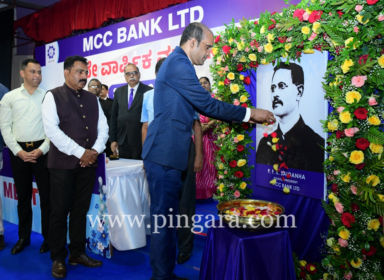 The meeting started with the lighting of lamp by Chairman Sahakara Ratna Anil Lobo, Vice Chairman Jerald Jude D’silva and Director David Dsouza and offering floral tributes to the Founder of the bank, P.F.X Saldanha by Chairman Anil Lobo, Vice Chairman Jerald Jude D’silva, Members Edmund Frank (Ex Vice Chairman of MCC Bank). Rons Bantwal, Rohan Monteiro (Managing Director, Rohan Corporation), Louis Pinto,(President Mand Sobhan) and Pius L Rodrigues (Ex. Director, Karnataka Pollusion and Control Board).