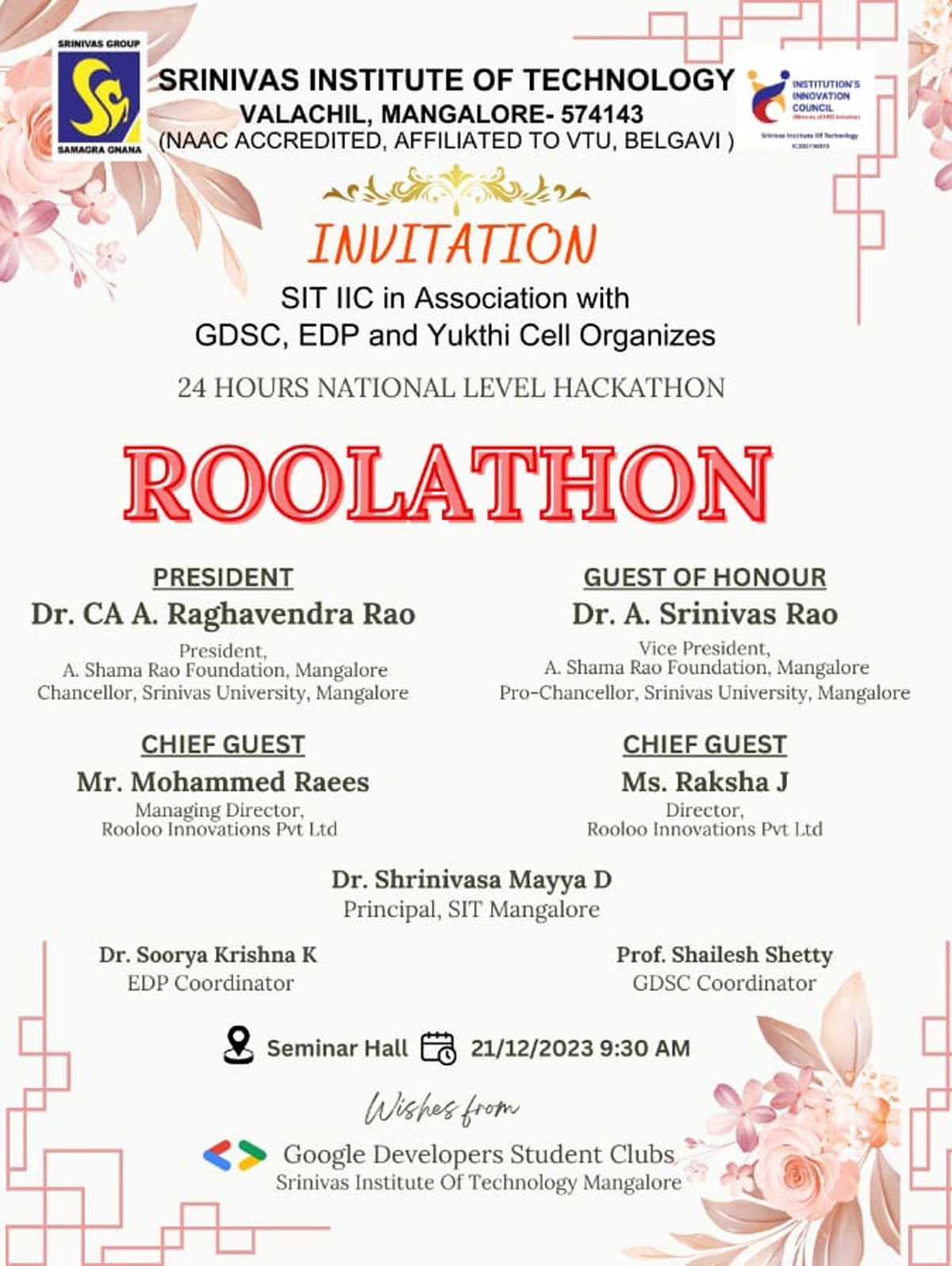 Mangaluru: "ROOLATHAN," a national-level 24-hour Hackathon, is scheduled to take place on December 21-22, 2023, at Srinivas Institute of Technology, Mangaluru. This Hackathon aims to unite students in addressing real-world challenges using technology. The event is organized by SIT's Institution's Innovation Council (IIC) in association with GDSC, EDP, and Yukthi Cell. This national-level 24-hour Hackathon will focus on three problem statements provided by the industry, along with an open theme: "Building a Community towards Sustainable Development." It offers a substantial prize pool of up to 20K and internship opportunities, motivating students to create impactful technologies for community improvement. Participants can develop solutions during “ROOLATHON” under the following tracks: