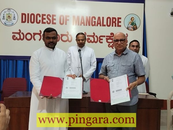 Mangalore – Renowned NRI entrepreneur and philanthropist Michael D’ Souza unveiled his ambitious Vision 2030 initiative aimed at empowering communities in the twin Dioceses of Karwar and Gulbarga through sustainable shelter and education programs. The event marked the signing of a Memorandum of Understanding (MoU) with the respective Bishops at Bishops House, Kodialbail, Mangalore, in the presence of Bishop Peter Paul Saldanha of Mangalore and Bishop Gerald Isaac Lobo of Udupi.