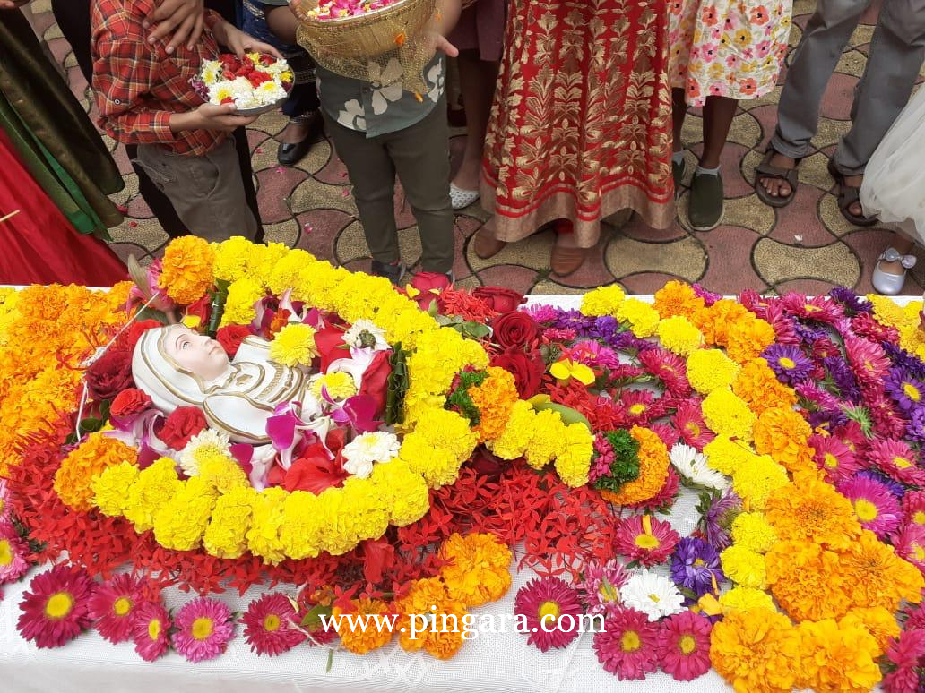 The celebration started with Fr. Sunil Menezes SVD, blessing the new sheaves of grain (Novem) at the grotto of Mother Mary. Singing the traditional hymn “Sakkad Sangatha Melyam, Moriyek Hogolsiyam”, the children and the congregation offered flowers to our beloved Monti Mai.