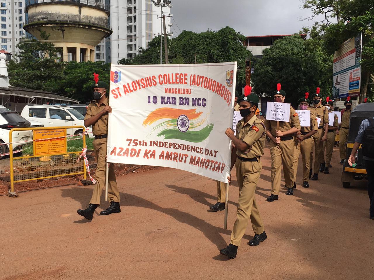 The rally began from St. Aloysius College and went across Hampankattamarket, cadets distributed 100 Indian flags to retail shops, banks (State bank of India and Karnataka Bank) and malls. The programme was organised under the guidance and support of Col N.R. Bhide (Commanding officer-18 KAR BN NCC), Lt.Col Amitabh Singh (Administrative officer-18 KAR BN NCC), Dr Praveen Martis, SJ, Principal of St Aloysius College (Autonomous) and CaptShakin Raj, Associated NCC Officer.