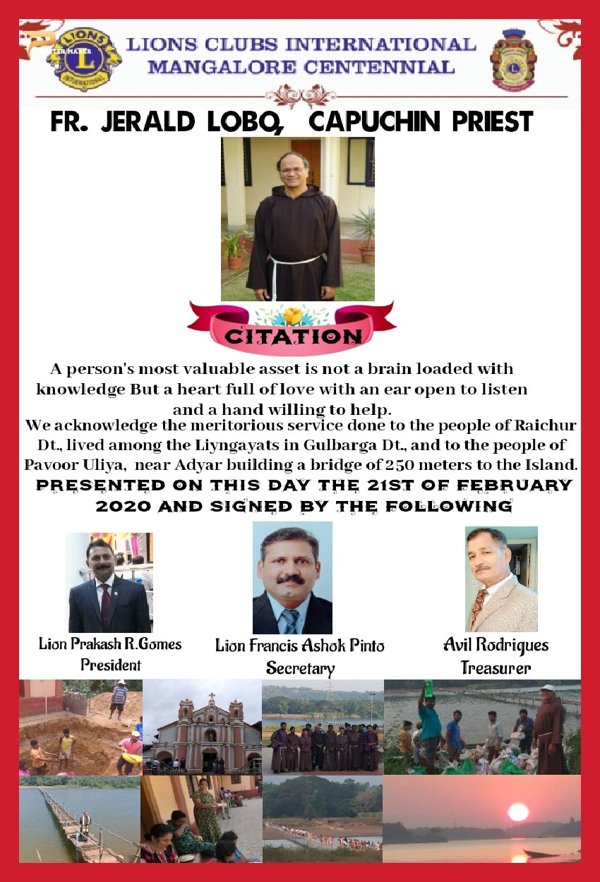 Pavoor, Uliya: Fr. Gerald Lobo was honoured by the Lion's Club International Mangalore Central for constructing the bridge at Pavoor, Uliya on 21st of February.