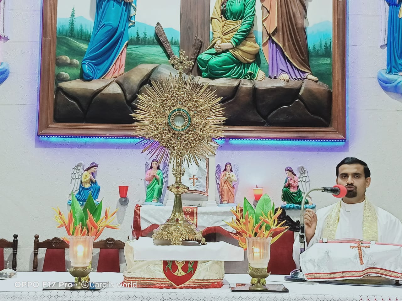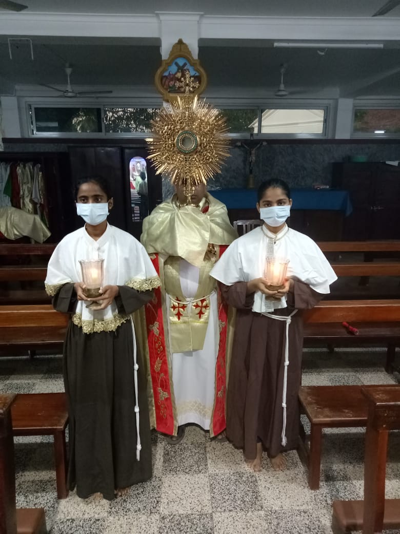 Fr Crasta called on the devotees to pray to St Anthony that he may intercede for the hungry and enlighten the good willing people, associations and the government that they may reach out to the hungry and satisfy them with much needed food. Today the Catholic Church observes the Precious Body and Blood of Christ. On this occasion a short procession was taken in the Ashram grounds. Fr Roshan D’Souza the Asst Director conducted the novena.