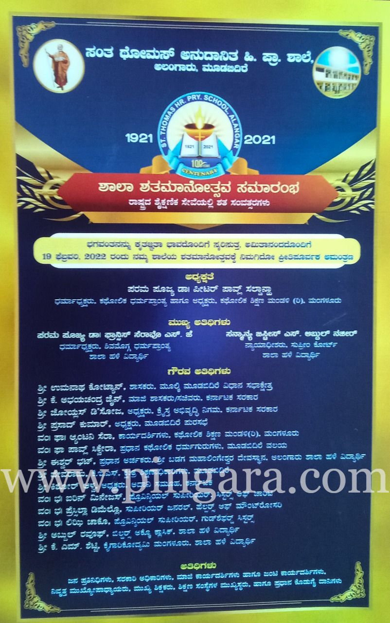 Stage programme will be held in the morning on February 19th as part of centenary celebration. Old student of the school and presently the Bishop of Shimoga Diocese Most Rev. Dr. Francis Serrao, SJ and another alumnus, Supreme Court Justice S. Abdul Nazeer will participate as Chief Guests. MLA Umanath Kotian, former minister K. Abhayachandra Jain, Chairman of Christian Development Board Joylus D’souza, Municipal Chairman Prasad Kumar, Secretary of Catholic Board of Education Rev. Fr. Antony Shera, Chief Catholic Parish Priest of Moodabidri circle Fr. Paul Sequeira, Eshwar Bhat, the head priest of Alangar Badaga Mahalingeshwar Temple, Education Officer of Moodabidri region Devaraju, Vice President of Adani Group Kishore Alva, Irene Menezes, Pricilla D’Mello, Lizzie Chako, Entrepreneurs Abdul Rawoof and K. M. Shetty will participate as the guests of honour. The programme will begin with Prayer at 9:30 a.m.