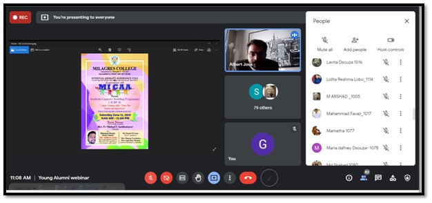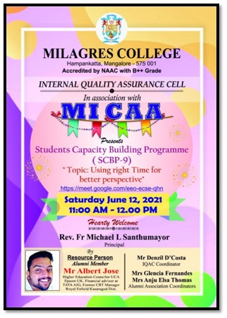 Mangalore: Milagres College Alumni Association (MICAA) and IQAC of the college organized a Student Capacity Building Program-9, titled “Using right time for better perspective” on Google Meet platform on June 12, 2021 at11.00AM-12.00 PM for the Final year B. Com students. An appropriate topic was chosen from the perspective of the present generation.
