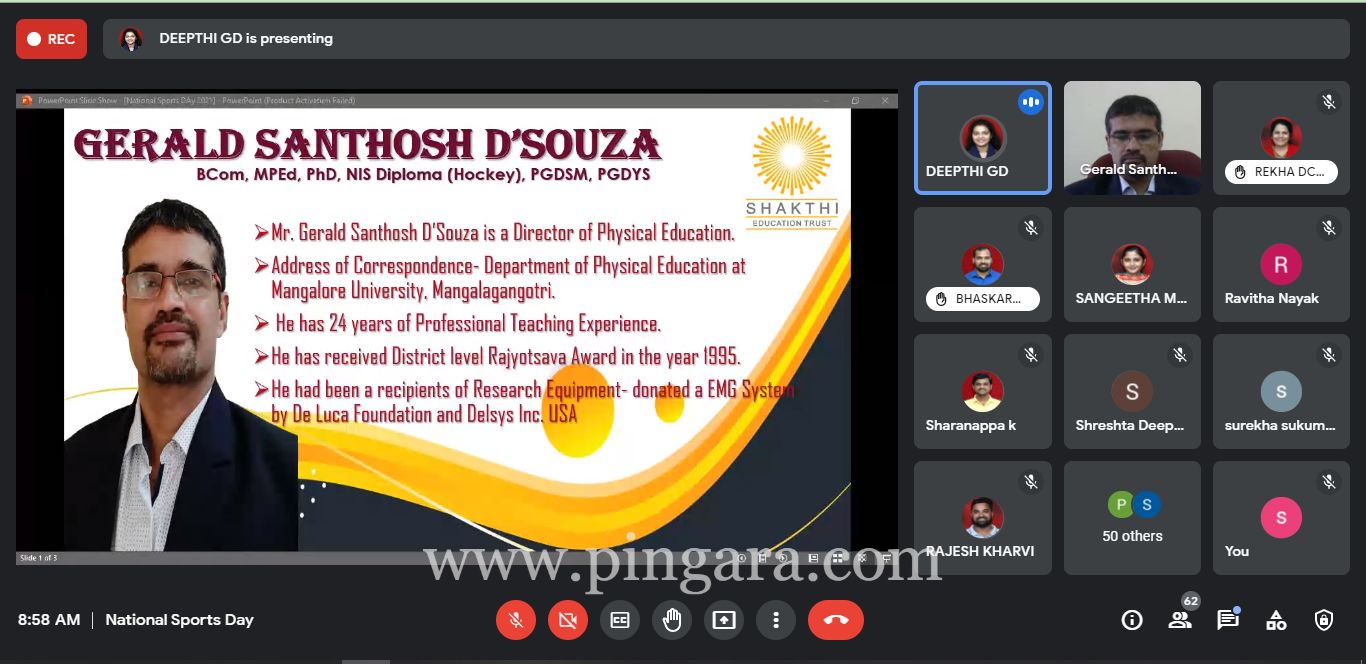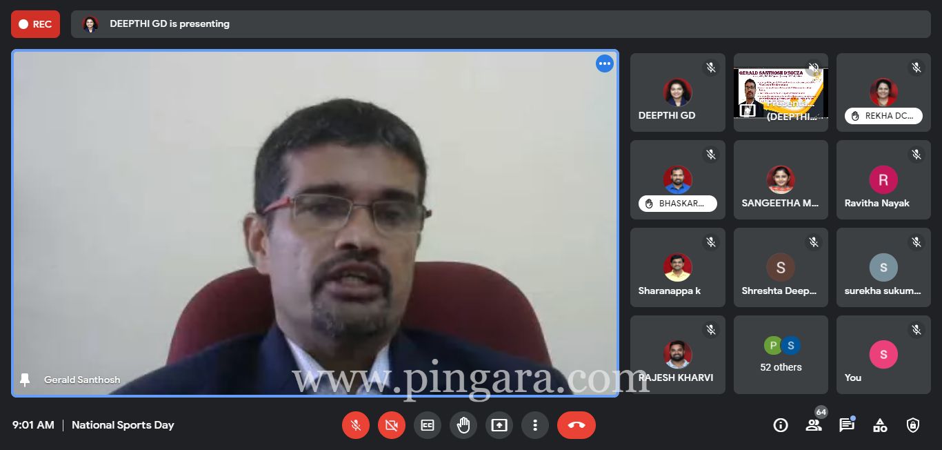 Mangalore: “Sports is the festival of life, it will never come in the way of academics. Never be afraid of losing. Competition and excellence comes out of participation. Learn to win and lose. Learn to be emotionally balanced and accept the loss as an experience” said Dr. Gerald Santosh Dsouza, Director, Physical Education, Department of Physical Education, Mangalore University speaking on the occasion of the virtual National Day celebration as the chief guest.