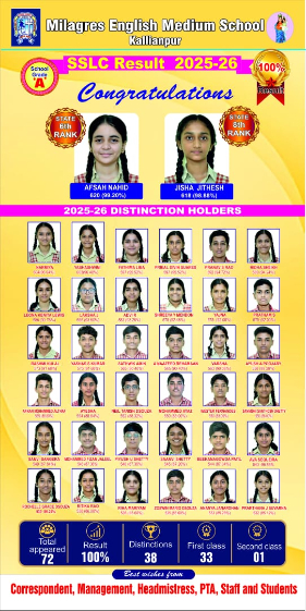 Kallianpur: Milagres English Medium School Kallianpur, has proud to share that secured 100% results in the SSLC Examination 2026. 72 students appeared in the Examination, 38 secured Distinction and 33 secured 1st Class and 1 student 2nd Class.