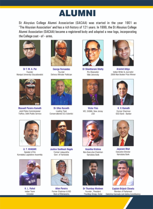 K. S. Hegde, Former Speaker of the Lok Sabha; Dr T. M. A. Pai, Founder of the Manipal Group, George Fernandes, eminent political leader; Justice Santhosh Hegde, Former Lokayukta; K. V. Kamath, BRICS Bank Chairman; Dr K. V. Rao, International Physicist; K. K. Venugopal, the present Attorney General; Aravind Adiga, Man Booker Prize winner; Anant Agarwal, CEO of edX; Dr K. Ullas Karanth, leading Conservation Zoologist; K. L. Rahul, Cricketer; are a few personalities among many others who have made a mark in public life exemplify the calibre of Aloysians who have left an indelible mark on society. Alongside these luminaries, thousands of graduates occupy key roles as entrepreneurs, CEOs, scientists, academicians and artists across continents. Its sustained engagement ensures that the strong bond between alumni and their alma mater continues to grow, inspiring current students and reinforcing the global Aloysian identity.