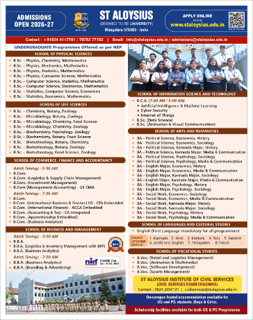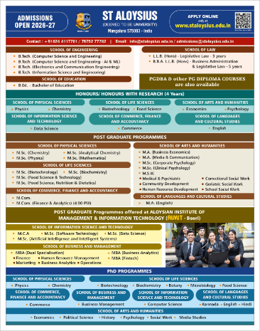 Mangaluru: St Aloysius (Deemed to be University), Mangaluru stands as a premier institution of higher learning, distinguished by a 146-year Jesuit legacy that blends academic excellence with values-driven education. Now in its third year as a Deemed-to-be University, it continues to advance its mission through rigorous scholarship, integral human formation, research-oriented exploration and a passionate commitment to societal transformation. As part of a globally renowned Jesuit network spanning more than 105 countries, the University provides a future-focused learning environment that nurtures ethical leaders, innovative thinkers and responsible global citizens equipped to excel in an ever-evolving world.