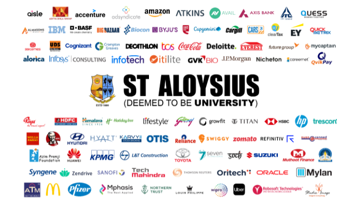 St Aloysius (Deemed to be University) offers a strong placement ecosystem driven by an active Training and Placement Cell that builds industry partnerships and prepares students for diverse career opportunities. Each year, top multinational and Indian companies—including Accenture, Amazon, Infosys, Deloitte, EY, KPMG, IBM, Capgemini, Toyota, Hyundai, HSBC, Pfizer, Wipro, Tech Mahindra, and many others—recruit students across IT, finance, consulting, manufacturing, healthcare, biotech, media, and more. Students receive comprehensive training in soft skills, resume building, interviews, group discussions, and domain-specific competencies, along with internship opportunities that often lead to job offers. With its focus on academic excellence, professionalism, and holistic development, the University produces confident, industry-ready graduates who are highly valued by employers.