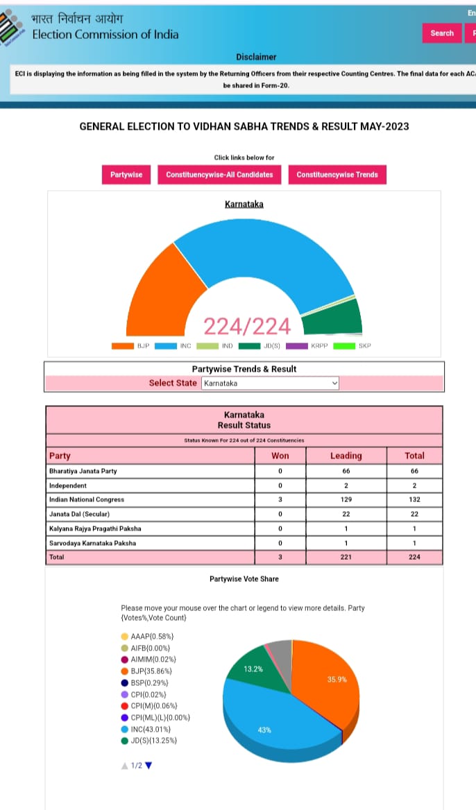 Jds which considered as king maker now at third place by congress clearly reaching the majority leading seats above 112.