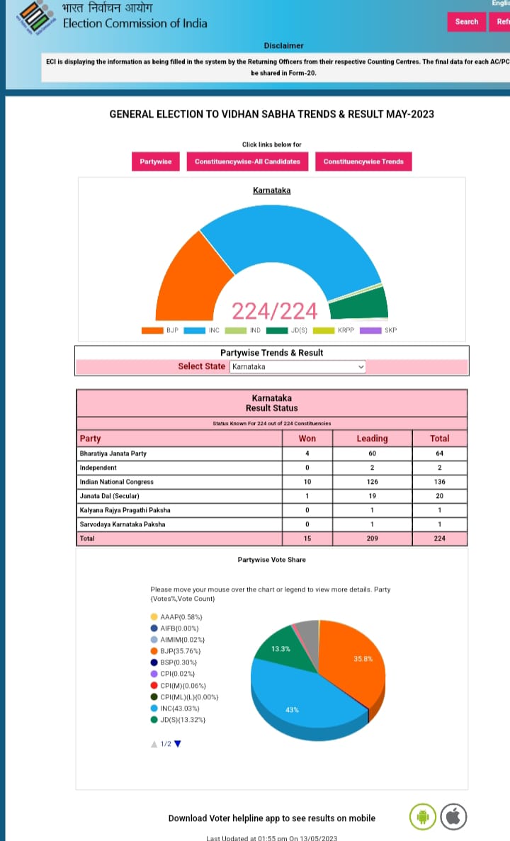 Bjp declined to 4 seat declared win and 60 leading total 64. now JDS 19 leading and one declared 20 at third place . Congress clearly reaching thumping above the majority leading seats above 112.