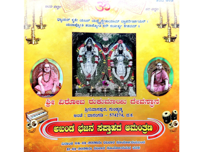 ಗುಂಡ್ಯಡ್ಕದ ಶ್ರೀನಿವಾಸಪುರದಲ್ಲಿರುವ ವಿಠೋಬ ರುಕುಮಾಯಿ ದೇವಾಲಯದಲ್ಲಿ ಜನವರಿ 4 ರಿಂದ 11 ರ ತನಕ ಅಖಂಡ ಭಜನಾ ಸಪ್ತಾಹ ಜರುಗಲಿದೆ. ವಿಠೋಬ ರುಕುಮಾಯಿ ಭಜನಾ ಮಂಡಳಿಯ ವಜ್ರ ಮಹೋತ್ಸವದ ಪ್ರಯುಕ್ತ ಲೋಕಕಲ್ಯಾಣಾರ್ಥವಾಗಿ ಶೃಂಗೇರಿ ಜಗದ್ಗುರು ಪೀಠಾಧೀಶ್ವರರ ಅನುಗ್ರಹದಂತೆ ಅಖಂಡ ಭಜನಾ ಸಪ್ತಾಹ ಜರುಗಲಿದೆ.