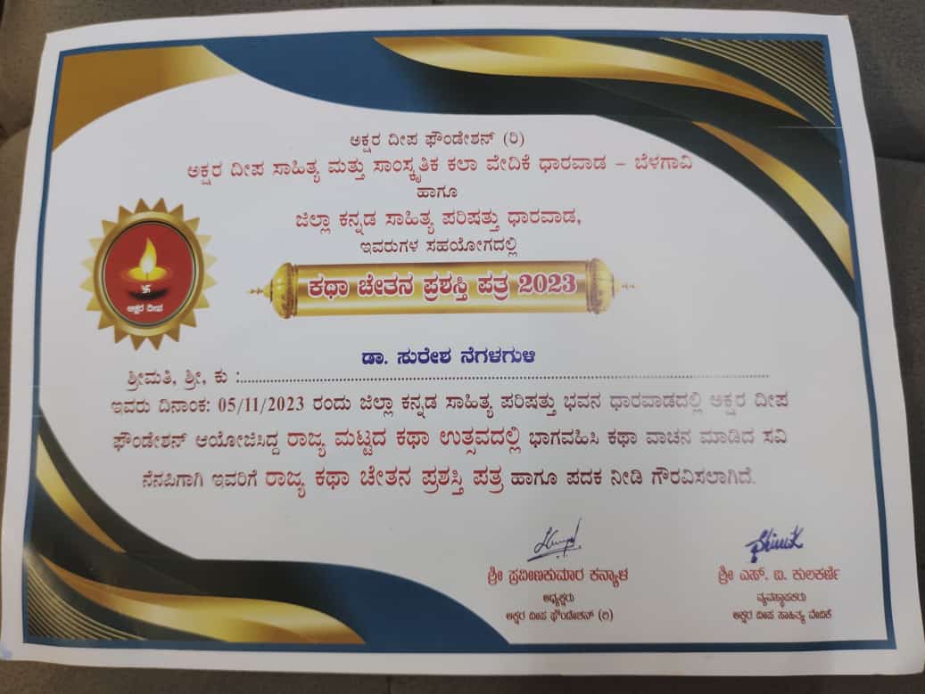 ಅಕ್ಷರ ದೀಪ ಫೌಂಡೇಶನ್ , ಅಕ್ಷರ ದೀಪ ಸಾಹಿತ್ಯ ಮತ್ತು ಸಾಂಸ್ಕೃತಿಕ ಕಲಾವೇದಿಕೆ ಧಾರವಾಡ ಹಾಗೂ ಜಿಲ್ಲಾ ಕನ್ನಡ ಸಾಹಿತ್ಯ ಪರಿಷತ್ತು ಧಾರವಾಡ ಸಹಯೋಗದಲ್ಲಿ ನವೆಂಬರ 5 ರ 23 ರಂದು ಆಯೋಜಿಸಿದ್ದ ರಾಜ್ಯ ಮಟ್ಟದ ಕಥಾ ಉತ್ಸವದಲ್ಲಿ ಮಂಗಳೂರಿನ ಮಂಗಳಾ ಆಸ್ಪತ್ರೆಯ ಶಸ್ತ ಚಿಕಿತ್ಸಕ ,ಕ್ಷಾರ ತಜ್ಞ ಹಾಗೂ ಬರಹಗಾರ ಡಾ ಸುರೇಶ ನೆಗಳಗುಳಿ ಇವರನ್ನು ಕಥಾ ಚೇತನ ರಾಜ್ಯ ಪ್ರಶಸ್ತಿ 2023ನ್ನು ನೀಡಿ ಗೌರವಿಸಲಾಯಿತು.
