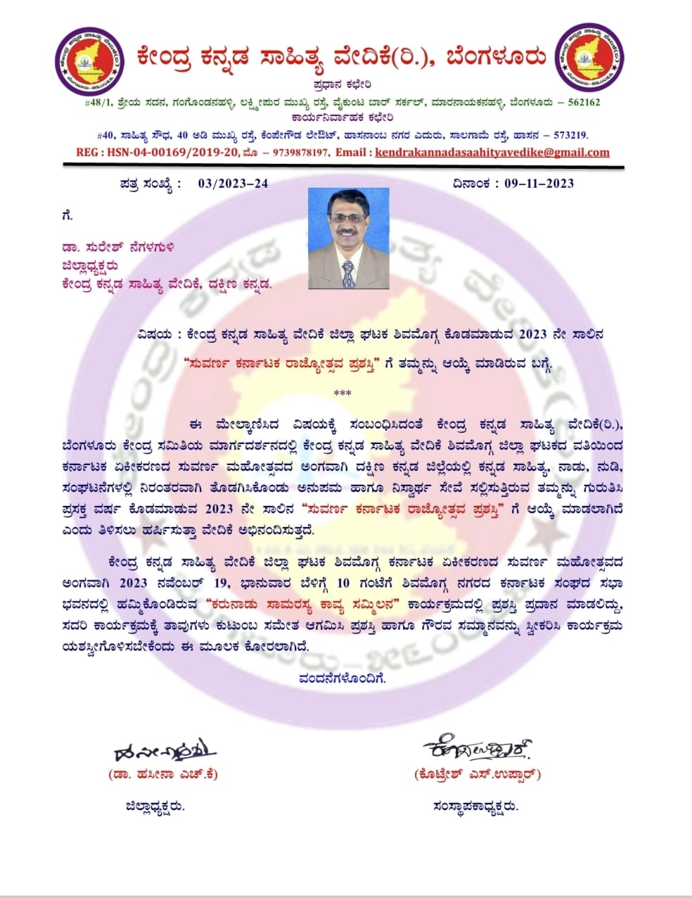 ಪ್ರವೀಣ್ ಕುಮಾರ್ ಕನ್ಯಾಳ ಮತ್ತು ಎಸ್ ಬಿ ಕುಲಕರ್ಣಿ ಇವರ ಸಾರಥ್ಯದಲ್ಲಿ ಜಿಲ್ಲಾ ಕನ್ನಡ ಸಾಹಿತ್ಯ ಪರಿಷತ್ತು ಭವನ ಧಾರವಾಡದಲ್ಲಿ ನಡೆದ ರಾಜ್ಯೋತ್ಸವ ಸಮಾರಂಭದಲ್ಲಿ ಈ ಪ್ರಶಸ್ತಿ ಪ್ರದಾನ ಮಾಡಲಾಯಿತು.