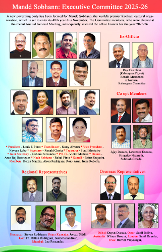 ಮಂಗಳೂರು: ನವೆಂಬರ್ನಲ್ಲಿ 40ನೇ ವರ್ಷಕ್ಕೆ ಪಾದಾರ್ಪಣೆಗೈಯುತ್ತಿರುವ, ವಿಶ್ವದ ಪ್ರಮುಖ ಕೊಂಕಣಿ ಸಾಂಸ್ಕೃತಿಕ ಸಂಘಟನೆ ಮಾಂಡ್ ಸೊಭಾಣ್ ಇದರ ನೂತನ ಆಡಳಿತ ಸಮಿತಿ ಅಸ್ತಿತ್ವಕ್ಕೆ ಬಂದಿದೆ. ಇತ್ತೀಚೆಗೆ ನಡೆದ ವಾರ್ಷಿಕ ಮಹಾಸಭೆಯಲ್ಲಿ ಆಯ್ಕೆಗೊಂಡ ಸದಸ್ಯರು ನಂತರ ಸಮಿತಿಯ ಪದಾಧಿಕಾರಿಗಳನ್ನು ಆಯ್ಕೆ ಮಾಡಿದರು.