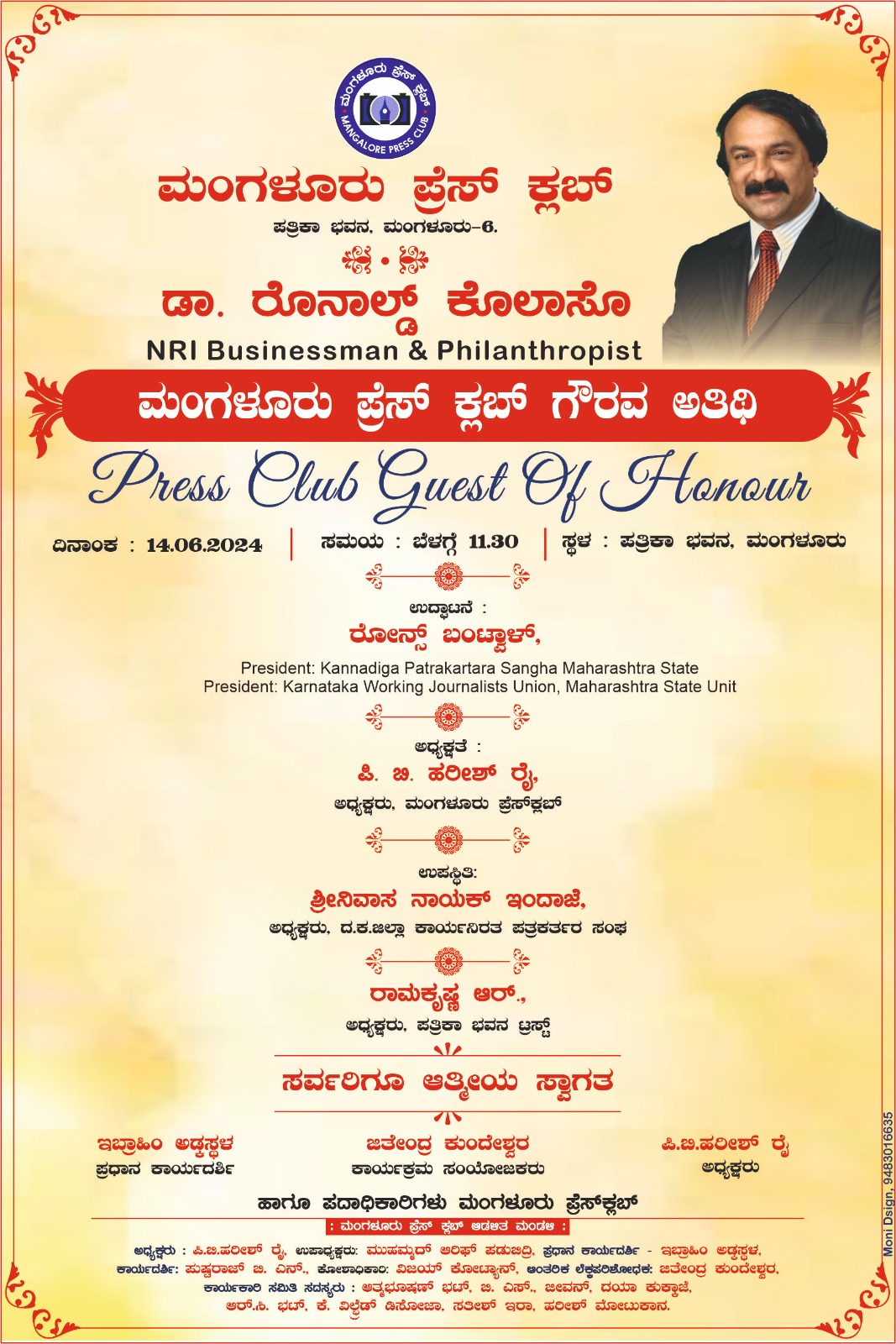 ಮಂಗಳೂರು: ಮಂಗಳೂರು ಪ್ರೆಸ್ ಕ್ಲಬ್ ವತಿಯಿಂದ ಜೂ. 14ರಂದು ಬೆಳಗ್ಗೆ 11.30 ಕ್ಕೆ ನಗರದ ಪತ್ರಿಕಾ ಭವನದಲ್ಲಿ ನಡೆಯುವ ಪ್ರೆಸ್ ಕ್ಲಬ್ ಗೌರವ ಅತಿಥಿ ಕಾರ್ಯಕ್ರಮದಲ್ಲಿ ಅನಿವಾಸಿ ಭಾರತೀಯ ಉದ್ಯಮಿ ಡಾ. ರೊನಾಲ್ಡ್ ಕೊಲಾಸೊ ಭಾಗವಹಿಸಿ ಗೌರವ ಸ್ವೀಕರಿಸಲಿದ್ದಾರೆ. ಕನ್ನಡಿಗ ಪತ್ರಕರ್ತರ ಸಂಘ ಮಹಾರಾಷ್ಟ್ರ ಇದರ ಅಧ್ಯಕ್ಷ ರೋನ್ಸ್ ಬಂಟ್ವಾಳ್ ಕಾರ್ಯಕ್ರಮ ಉದ್ಘಾಟಿಸಲಿದ್ದಾರೆ.