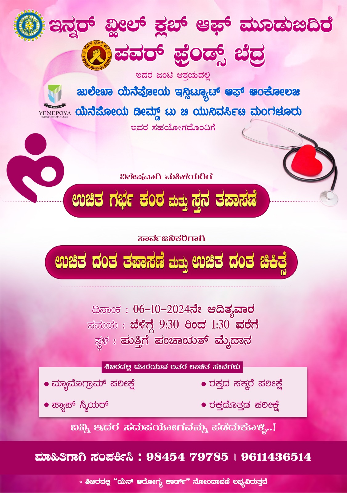ಮೂಡುಬಿದಿರೆ: ಸ್ಥಳೀಯ ಇನ್ನರ್ ವೀಲ್ ಕ್ಲಬ್ ಮತ್ತು ಪವರ್ ಫ್ರೆಂಡ್ಸ್ ಬೆದ್ರದವರ ಆಶ್ರಯದಲ್ಲಿ ಅಕ್ಟೋಬರ್ 6 ಆದಿತ್ಯವಾರದಂದು ಪುತ್ತಿಗೆ ಪಂಚಾಯತ್ ಮೈದಾನದಲ್ಲಿ ಮಂಗಳೂರಿನ ಜುಲೇಖ ಏನಪಾಯ ಇನ್ಸ್ಟಿಟ್ಯೂಟ್ ನವರ ಸಹಯೋಗದಲ್ಲಿ ಮಹಿಳೆಯರಿಗಾಗಿ ಉಚಿತ ಗರ್ಭ ಕಂಠ ಮತ್ತು ಸ್ತನ ತಪಾಸಣೆ ಹಾಗೂ ಸಾರ್ವಜನಿಕರಿಗೆ ಉಚಿತ ದಂತ ತಪಾಸಣೆ ಮತ್ತು ಚಿಕಿತ್ಸಾ ಶಿಬಿರವನ್ನು ಹಮ್ಮಿಕೊಳ್ಳಲಾಗಿದೆ.