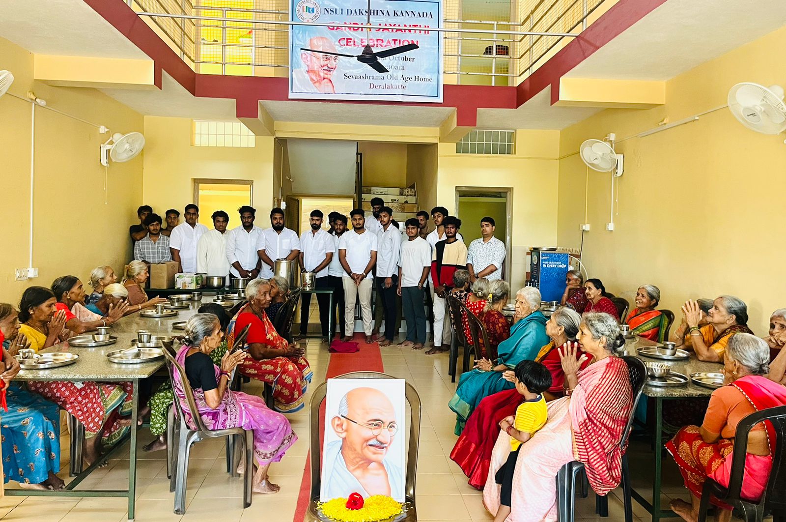 ಗಾಂಧಿ ಜಯಂತಿಯ ಪ್ರಯುಕ್ತ ದಕ್ಷಿಣ ಕನ್ನಡ ಜಿಲ್ಲಾ NSUI ವತಿಯಿಂದ ಮಂಗಳೂರು ತಾಲೂಕಿನ ದೇರಳಕಟ್ಟೆಯ "ಸೇವಾಶ್ರಮ" (ವೃದ್ದಾಶ್ರಮ)ದಲ್ಲಿ ಹಿರಿಯ ನಾಗರಿಕರೊಂದಿಗೆ ಆಚರಿಸಲಾಯಿತು, ಬೆಳಗ್ಗಿನ ಉಪಹಾರವನ್ನು ನೀಡಿ ಆಶೀರ್ವಾದವನ್ನು ಪಡೆಸುಕೊಂಡರು