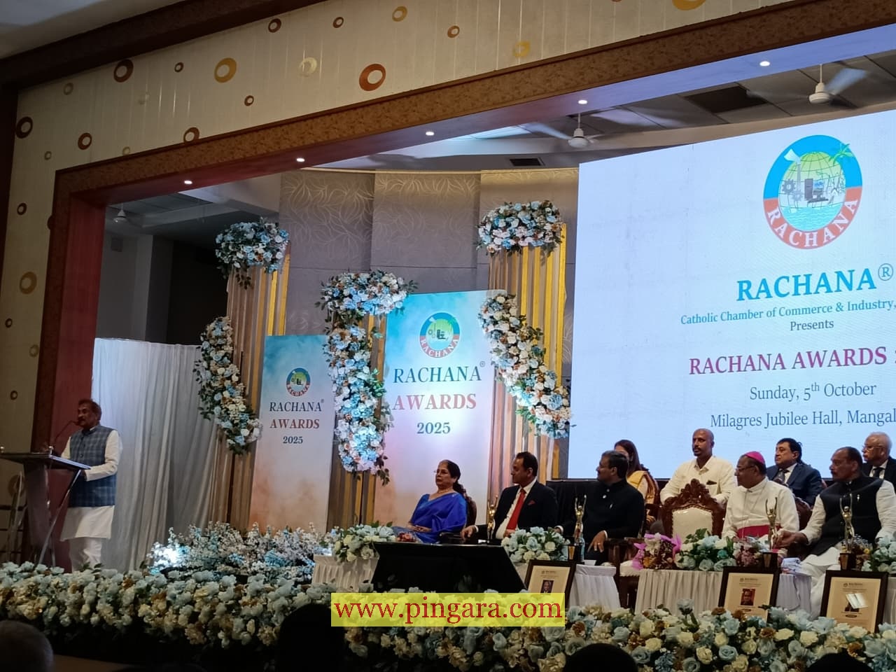 Mangaluru: K. J. George Hon. Minister for Energy Government of Karnataka commended the contributions of Christian leaders in politics, naming stalwarts like Oscar Fernandes, George Fernandes and Michael Fernandes as inspiring examples. "Jesus Christ said, ‘Help those in need.’ Today, people talk about guarantee programs, but the real issue is addressing the actual needs of the people—especially women, who make immense sacrifices for their families." The Rachana Awards 2025, an esteemed recognition by Rachana- Catholic Chamber of Commerce and Industry, celebrated five outstanding achievers in various fields. The Award ceremony was held today October 05, 2025 at Milagres Jubliee Hall, Mangaluru The event was graced by K.J. George, Hon. Minister for Energy, Government of Karnataka, as the Chief Guest.